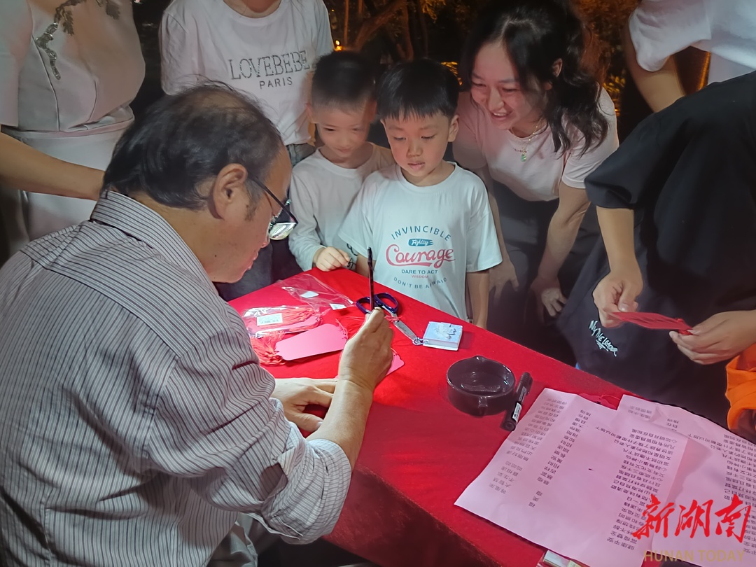 朦胧月色笼罩下的神农公园显得格外华美与温馨,整个公园内摊铺林立,灯火通明,市民游意高涨,兴致盎然。芦淞区文联、芦淞区书法协会组织数位书法家和党员文艺志愿者到场为群众书写许愿签,月韵华章,拜月祈福,为游园会增添了翰墨色彩。