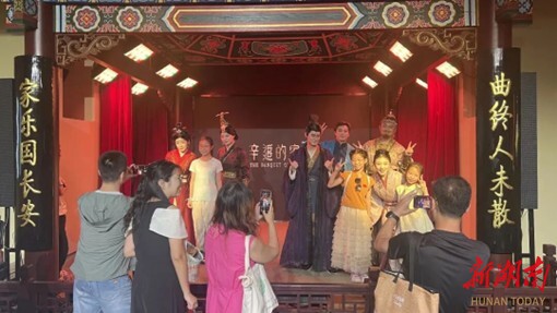 谢幕后,舞台就被观众团团围住,大家举着手机、相机挤到前排,有的游客拉着家人和主演同框,有的小朋友踮着脚要和“辛追”握手,观众边合影边赞叹“演得太好,没看够”。在“雅韵三湘”小剧场PK秀贴纸点赞环节,观众争相为喜爱的环节贴票,现场欢呼声不断。