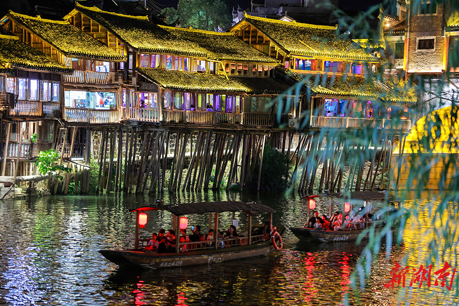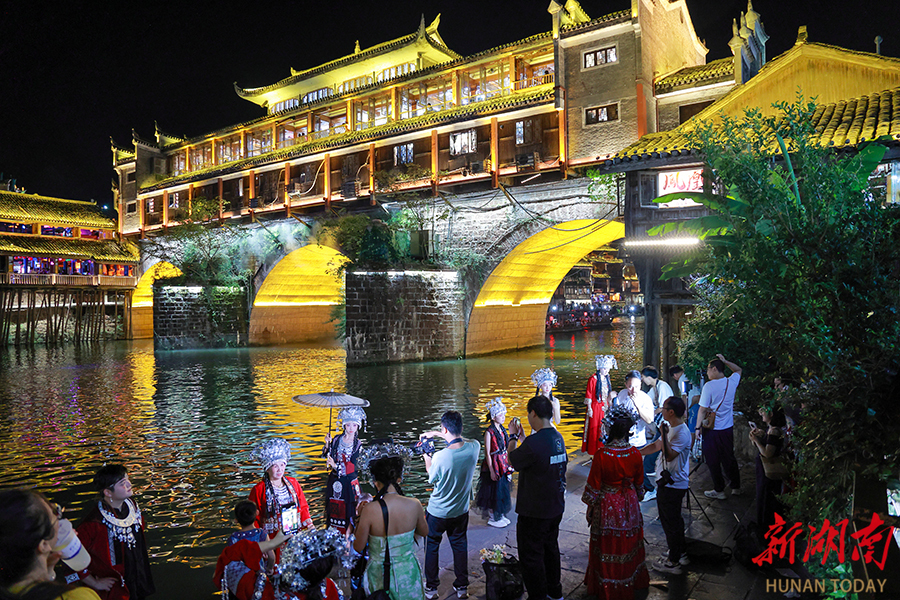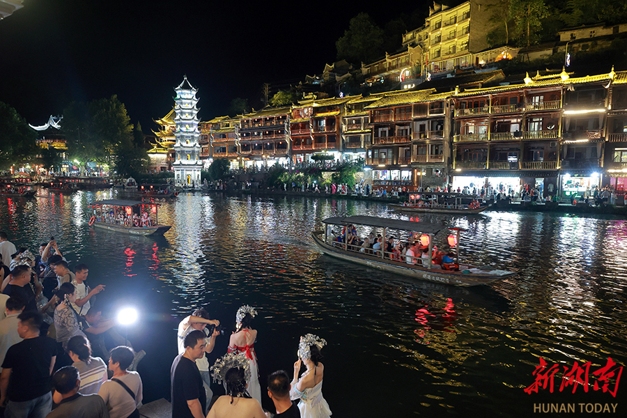 10月2日晚,凤凰古城沱江两岸灯火璀璨,游客乘船夜行、驻足拍照,尽享古城夜色。国庆期间,该景区通过丰富夜态行游产品,让游客深度体验湘西民俗与自然风光之美。 滕树明 摄(湖南图片库)