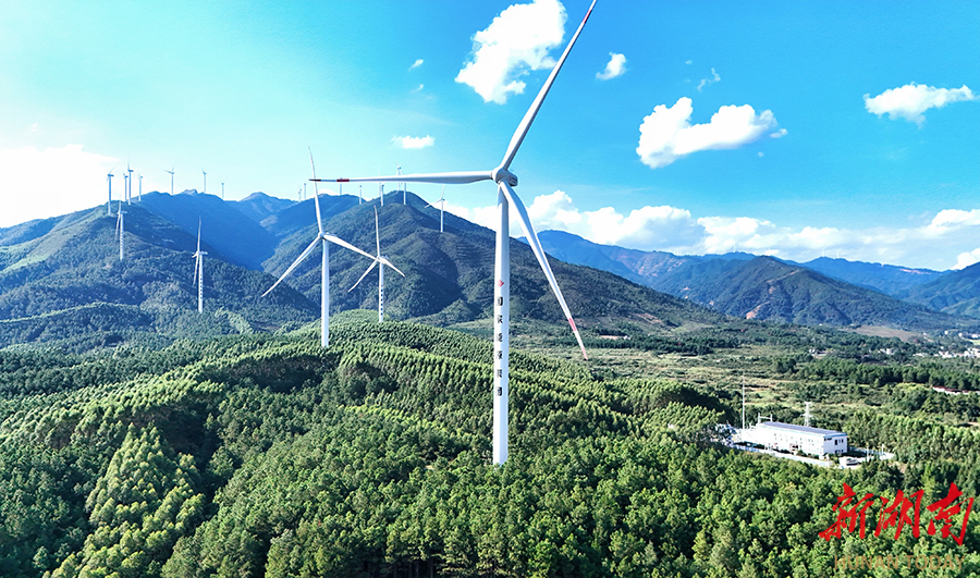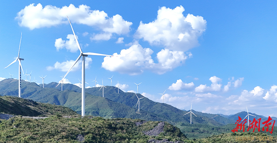 10月3日,江永县潇浦镇的山坡上,风力发电机组与蓝天白云相映成景。近年来,该县依托风光能和山地资源优势,有序推进风电、光伏等新能源项目建设,探索“新能源+旅游+生态”的产业融合发展模式。 田如瑞 摄(湖南图片库)