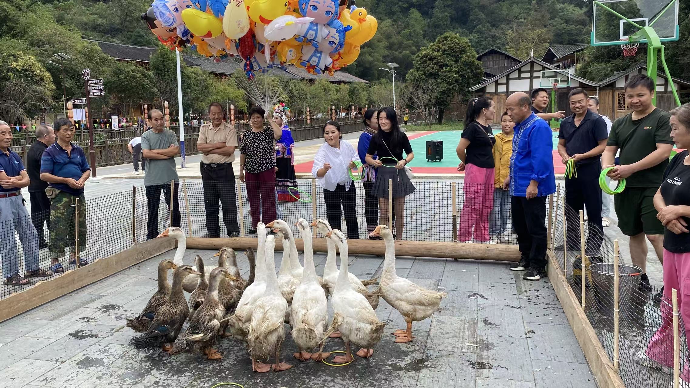 套大鹅游戏区人头攒动,20元10个圈的简单玩法引得游客跃跃欲试。“刚套中一只大鹅,太惊喜了!既能玩游戏又能捎带新鲜食材,这趟苗寨之行太值了。”衡阳游客阳后华举着“战利品”笑道。
