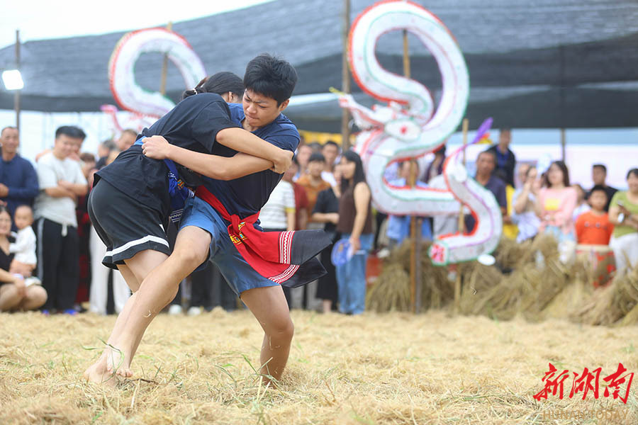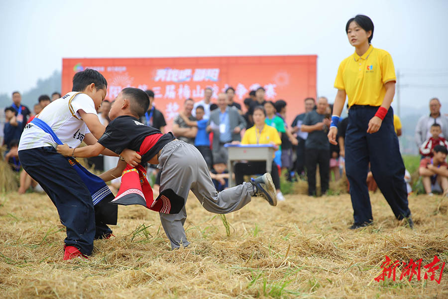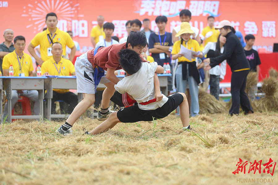 10月4日,参赛选手在比赛中。当天,邵阳市第三届梅山跤术争霸赛在隆回县金石桥镇稻田跤场举行。来自6省份的25支队伍、262名选手按6个年龄组别展开角逐。在梅山地区,当地民众常在秋收后的稻田菜地里举办摔跤活动,以跤会友。梅山跤术俗称“箍腰子”,是梅山武术中踢、打、摔、拿四大主技之一。 曾勇 摄(湖南图片库)