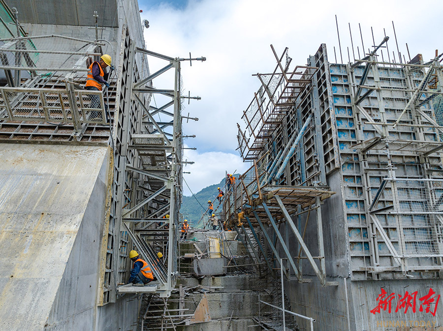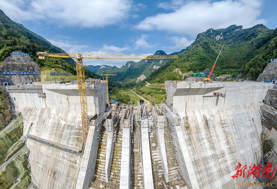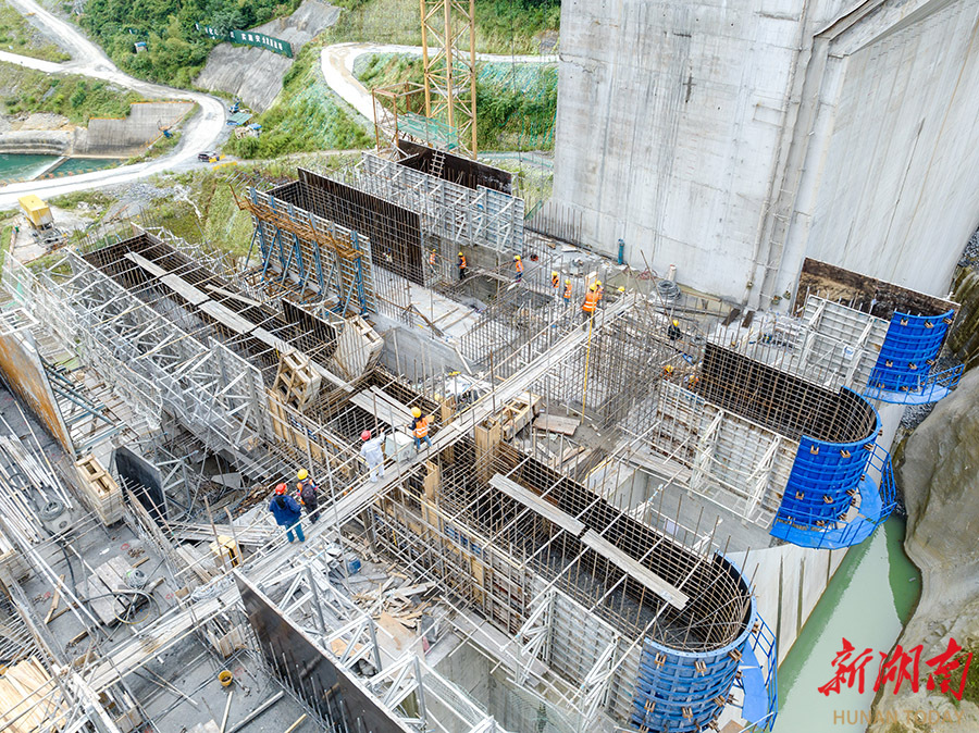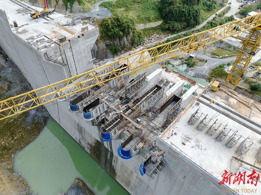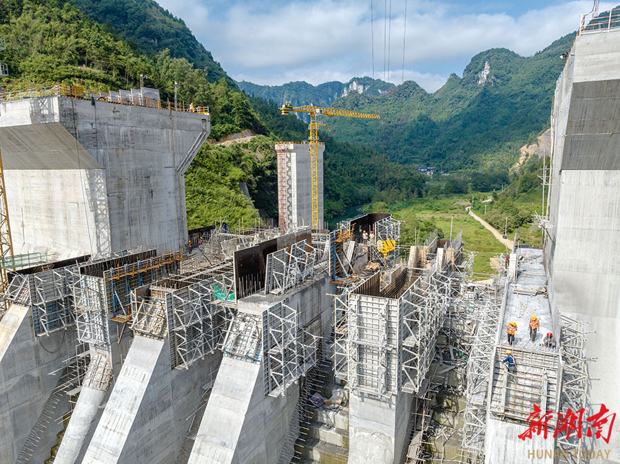 10月4日,吉首市矮寨镇大兴寨水库工程建设现场,工人正在进行8#9#溢流坝段施工。国庆假期,建设者们放弃休假,坚守岗位,全力推进这一重点水利工程建设。 彭璟 摄(湖南图片库)