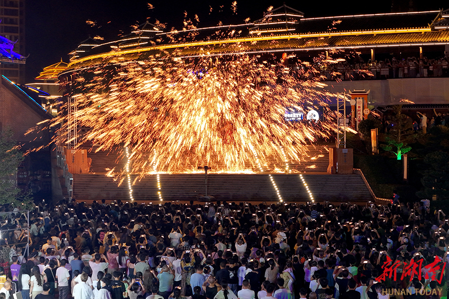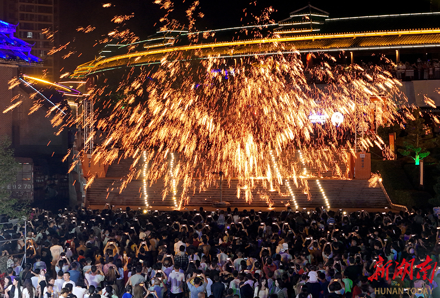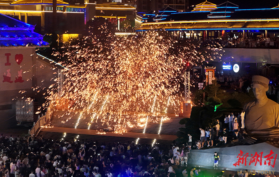 10月3日晚,通道侗族自治县萨岁广场上演非遗打铁花表演,吸引众多市民游客驻足观赏。国庆假期,该县推出非遗展示、音乐演出等系列活动,打造特色夜间文旅消费场景,推动文旅深度融合发展。 李尚引 摄(湖南图片库)