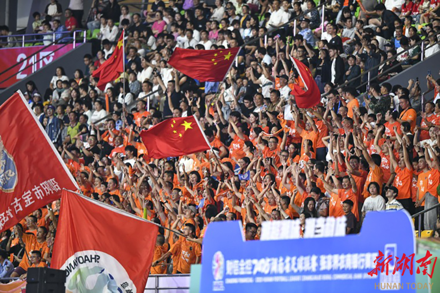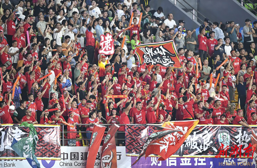 10月4日晚,张家界贺龙国际体育中心,球迷在加油呐喊。当晚,2025湖南省足球联赛(简称“湘超联赛”)张家界队(红)主场迎战邵阳队。比分最后定格在1比1,双方握手言和。 向韬 摄(湖南图片库)