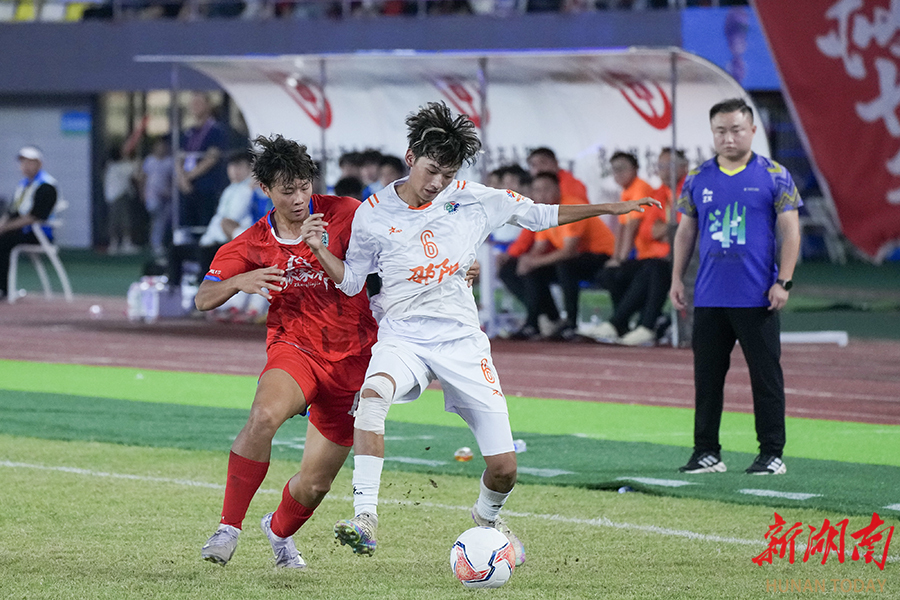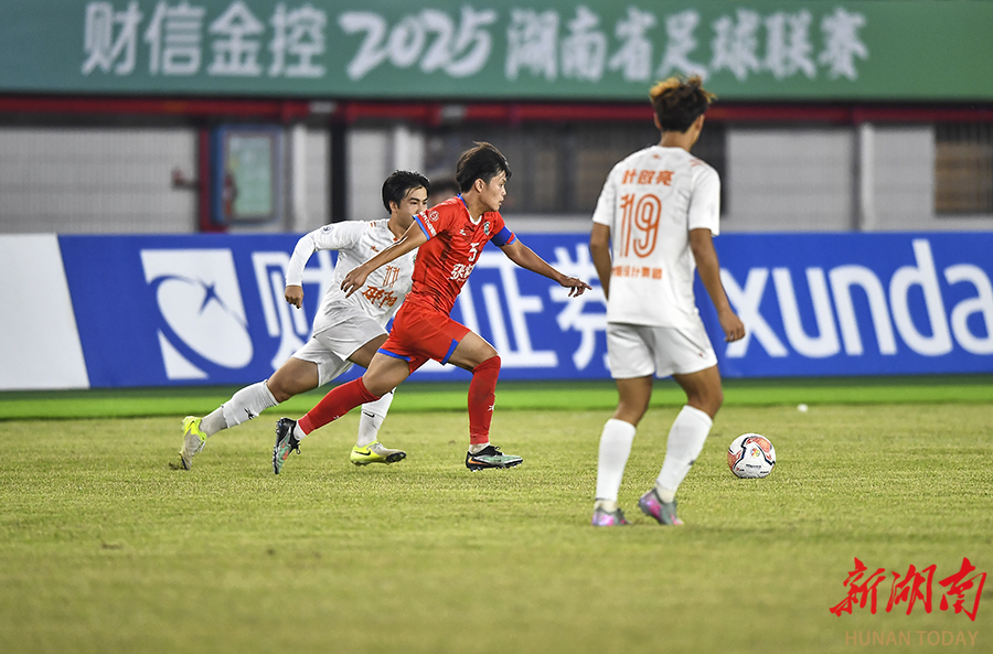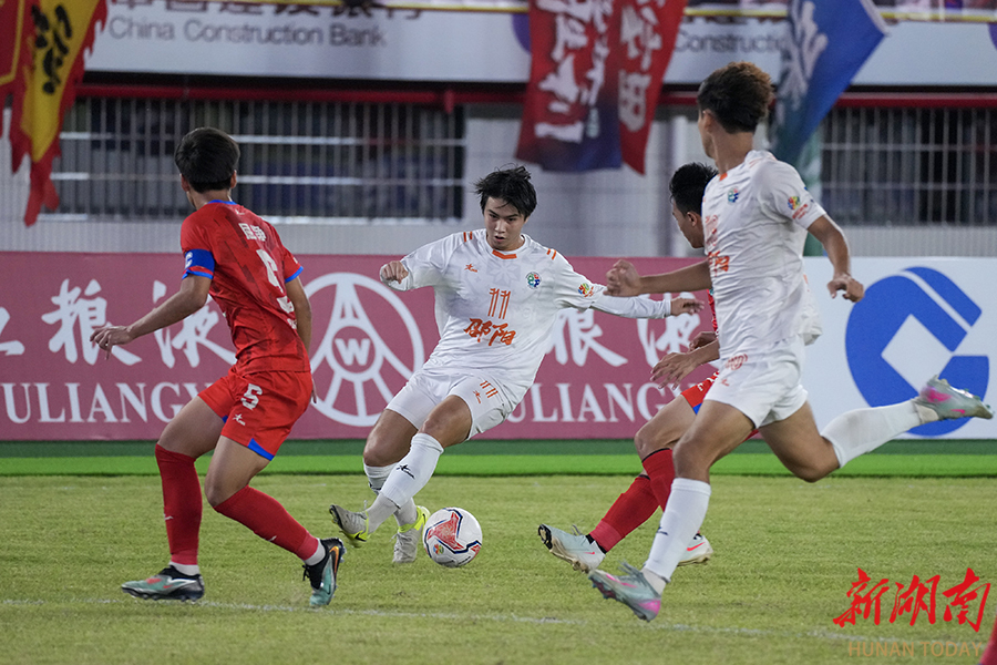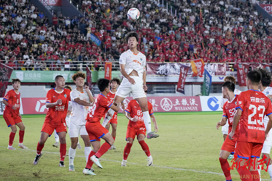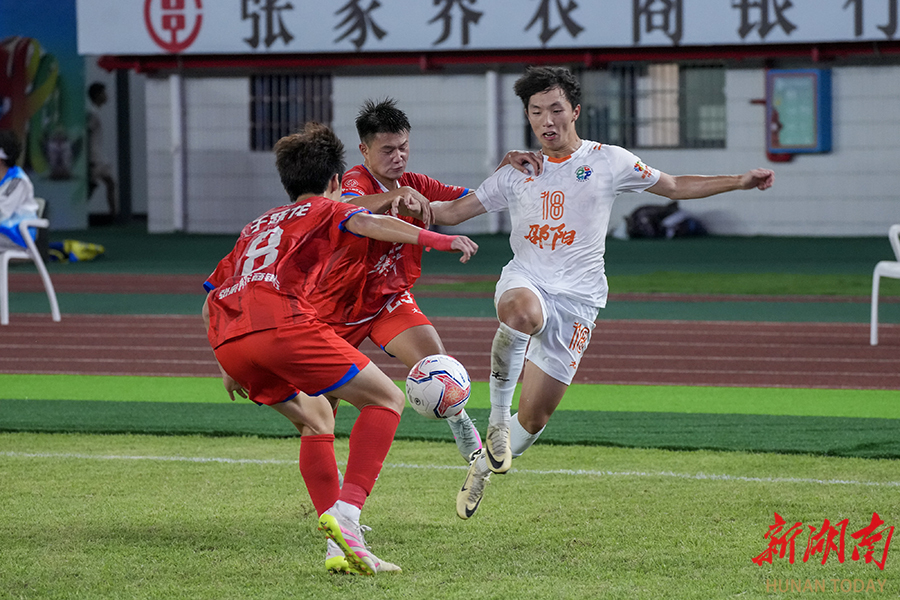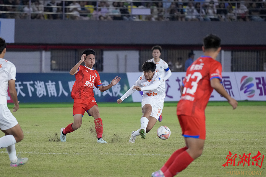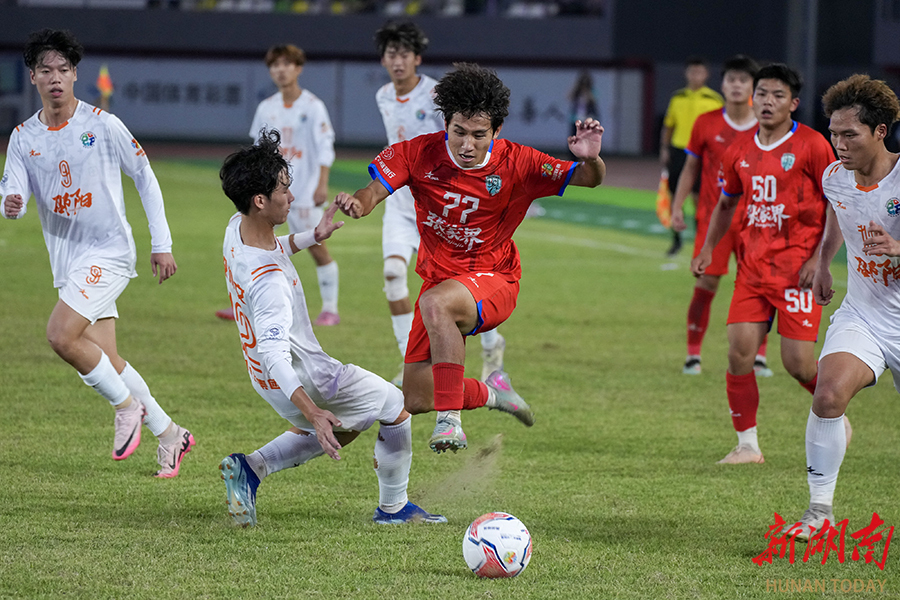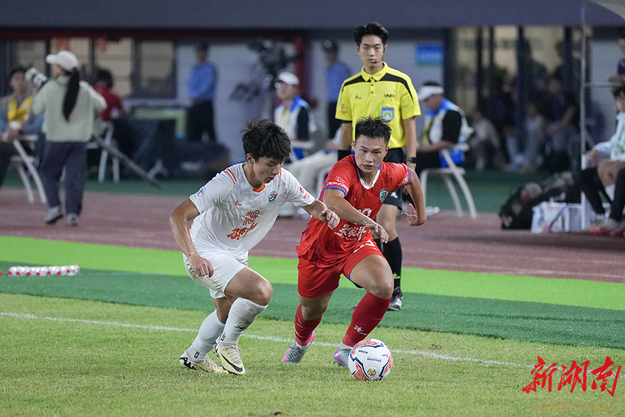 10月4日晚,张家界贺龙国际体育中心,两队球员在比赛中奋力拼抢。当晚,2025湖南省足球联赛(简称“湘超联赛”)张家界队(红)主场迎战邵阳队。比分最后定格在1比1,双方握手言和。 邵颖 摄(湖南图片库)