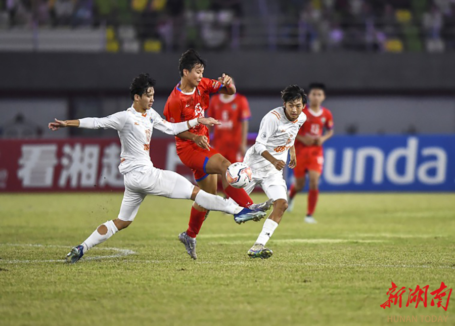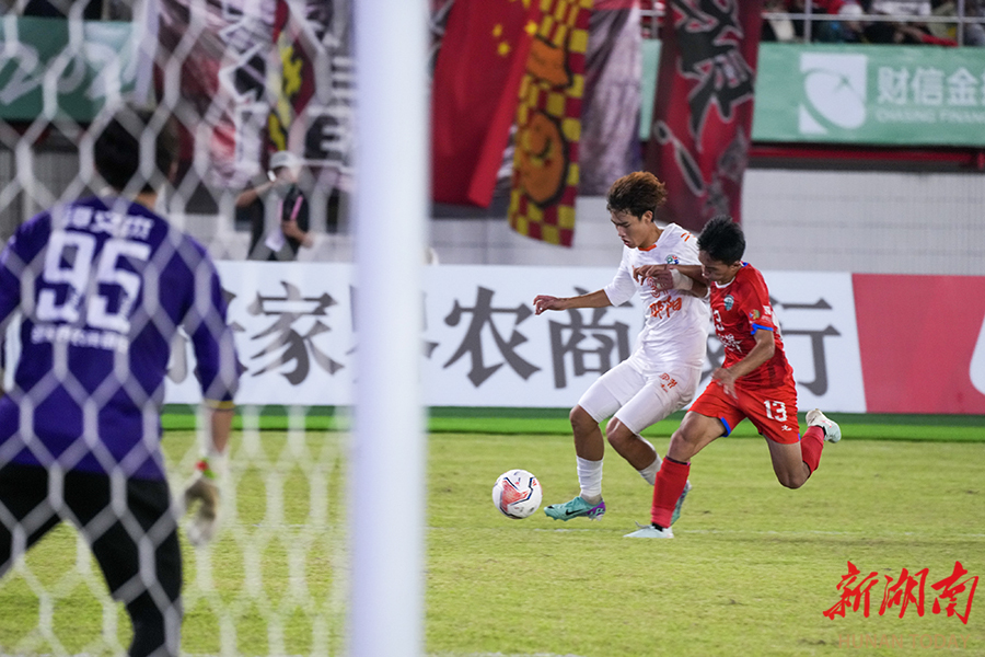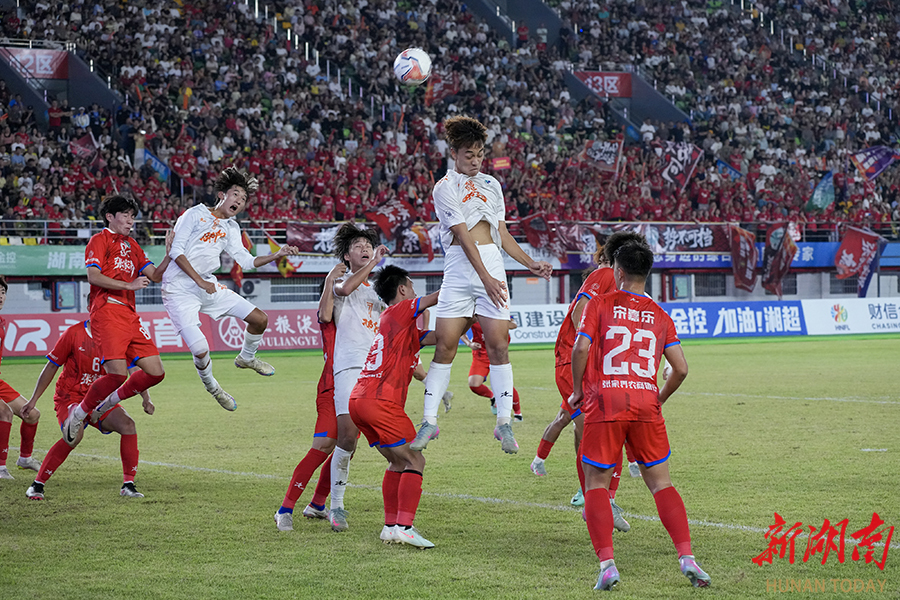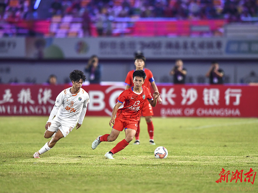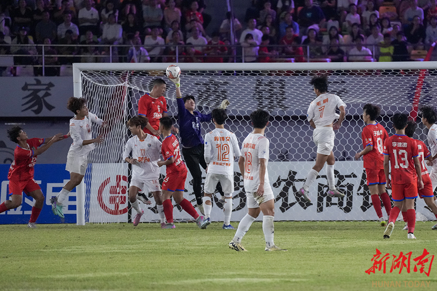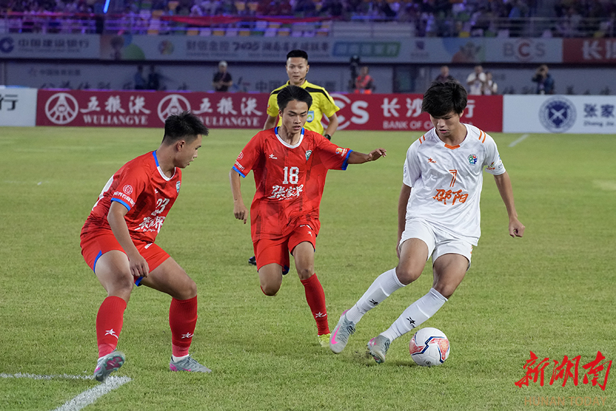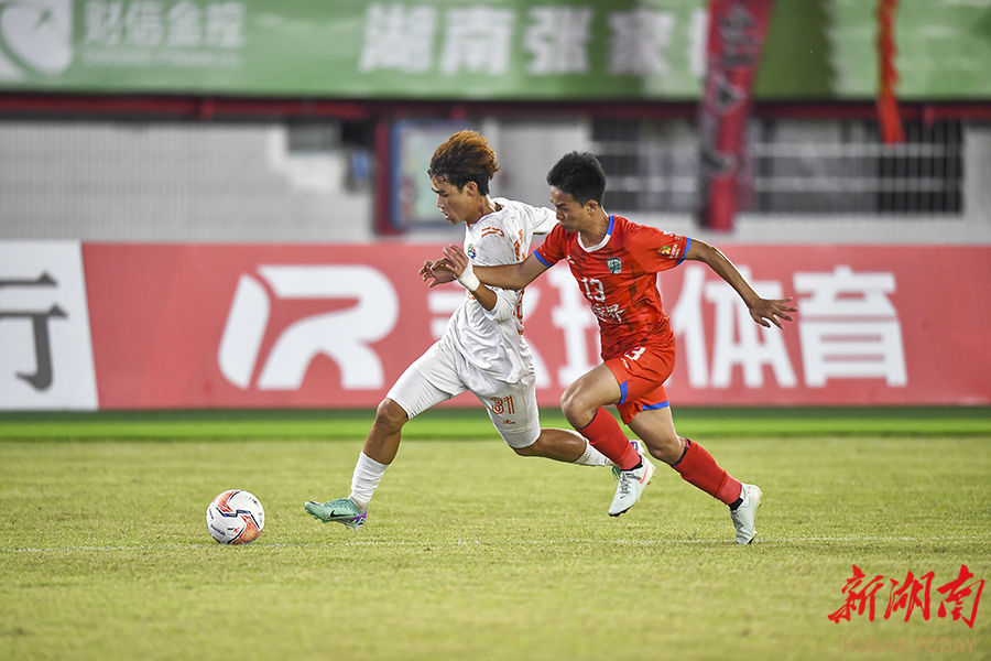 10月4日晚,张家界贺龙国际体育中心,两队球员在比赛中奋力拼抢。当晚,2025湖南省足球联赛(简称“湘超联赛”)张家界队(红)主场迎战邵阳队。比分最后定格在1比1,双方握手言和。 邵颖 摄(湖南图片库)
