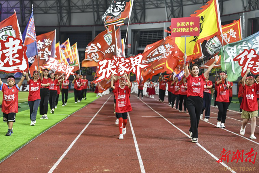 10月4日晚,张家界贺龙国际体育中心,巡游方阵跨界融合,瞬间点燃全场。当晚,2025湖南省足球联赛(简称“湘超联赛”)张家界队(红)主场迎战邵阳队。比分最后定格在1比1,双方握手言和。 邵颖 摄(湖南图片库)