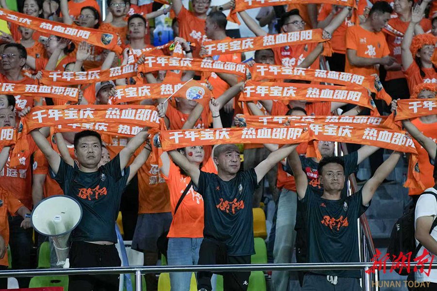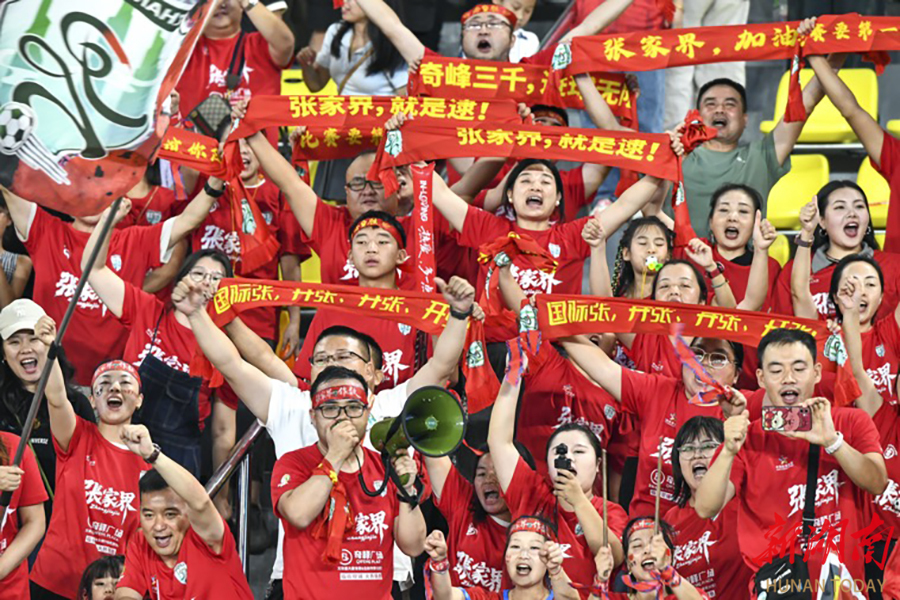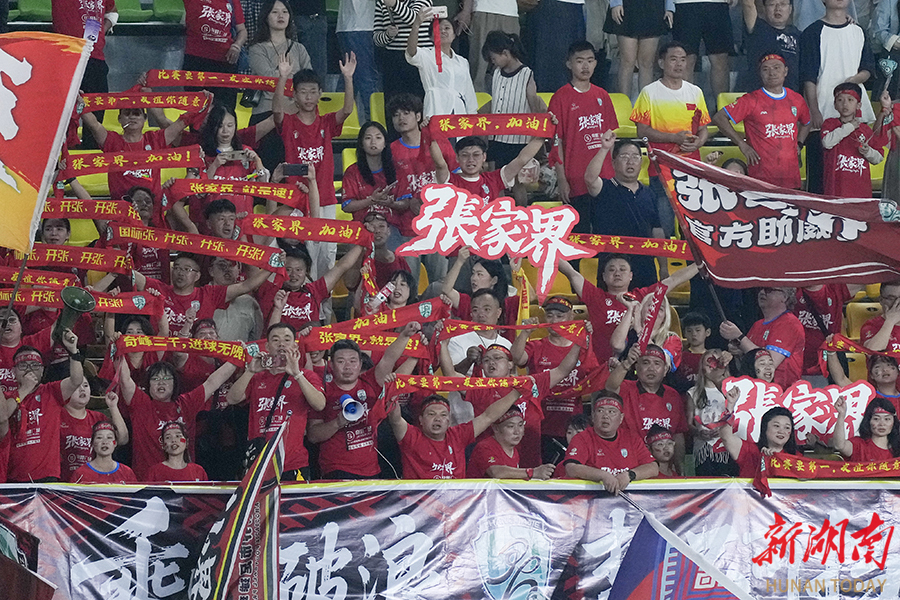10月4日晚,张家界贺龙国际体育中心,球迷在加油呐喊。当晚,2025湖南省足球联赛(简称“湘超联赛”)张家界队(红)主场迎战邵阳队。比分最后定格在1比1,双方握手言和。 邵颖 摄(湖南图片库)
