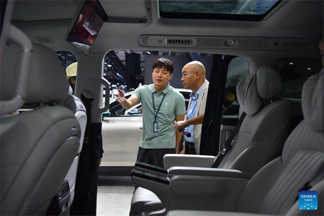 Visitors view a car displayed at an automobile consumption promotion event held in Changsha, central China's Hunan Province, Oct. 1, 2025. The event kicked off at Hunan International Convention and Exhibition Center on Wednesday with an aim to activate the vitality of the automotive consumption market. (Xinhua/Ding Chunyu)
