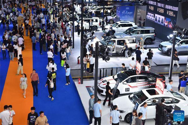 Visitors view cars displayed at an automobile consumption promotion event held in Changsha, central China's Hunan Province, Oct. 1, 2025. The event kicked off at Hunan International Convention and Exhibition Center on Wednesday with an aim to activate the vitality of the automotive consumption market. (Xinhua/Ding Chunyu)