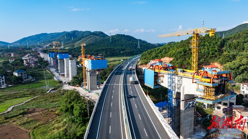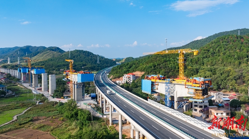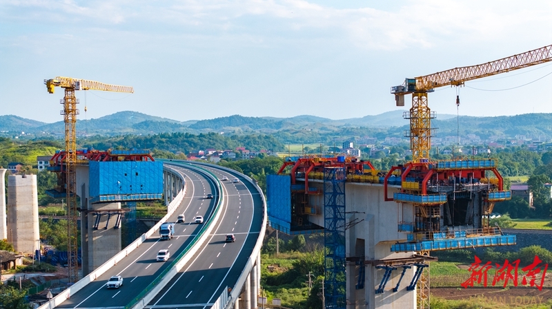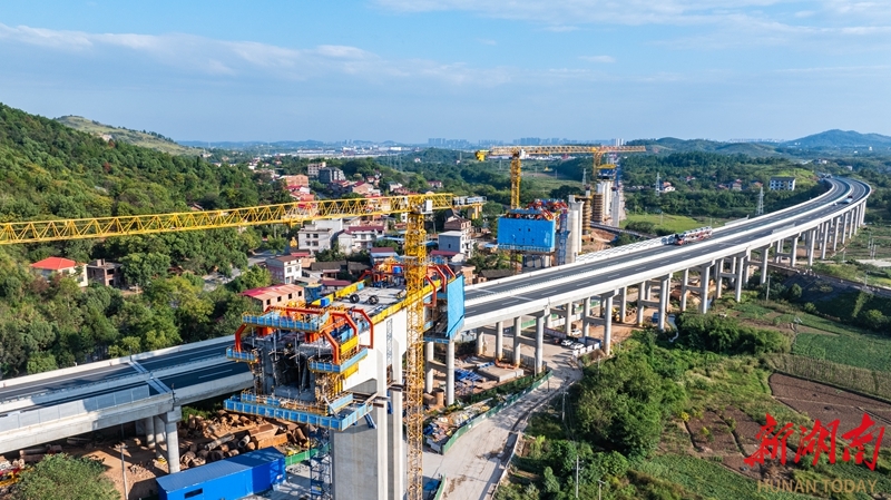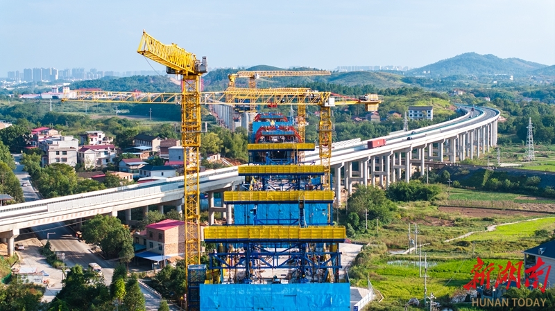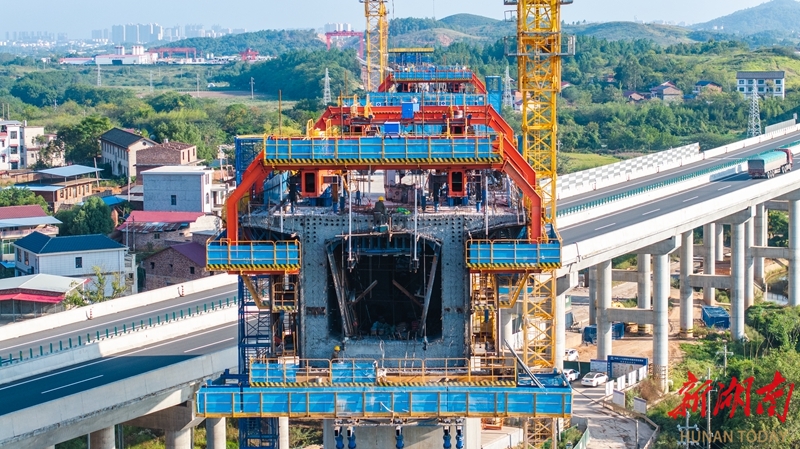 10月5日,永州市邵(阳)永(州)高铁跨芦洪江特大桥项目建设现场,中铁二十五局施工人员正在施工。国庆中秋假期,邵永高铁项目建设者们坚守岗位一线,抢抓施工黄金期,全力推进项目建设进度。邵永高铁是国家“八纵八横”高铁网中呼和浩特至南宁通道的重要组成部分。建成后,对完善区域铁路网布局、促进中部地区高质量发展具有重要意义。雷中祥 摄(湖南图片库)
