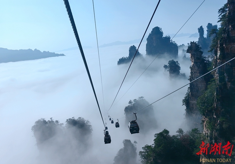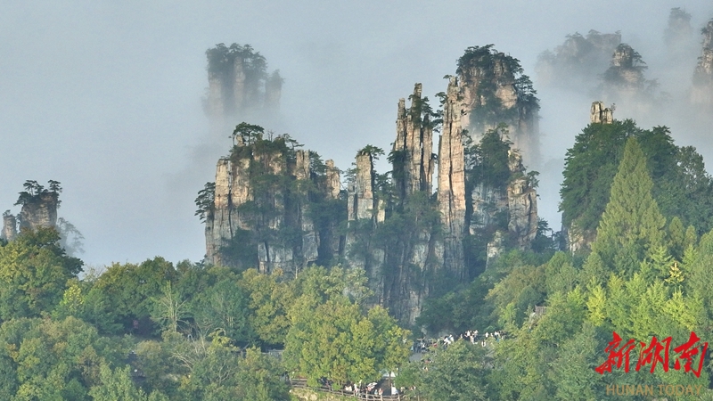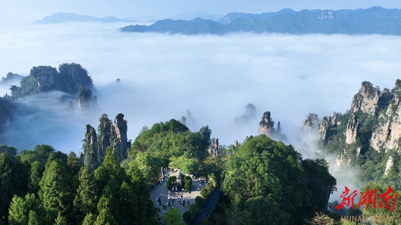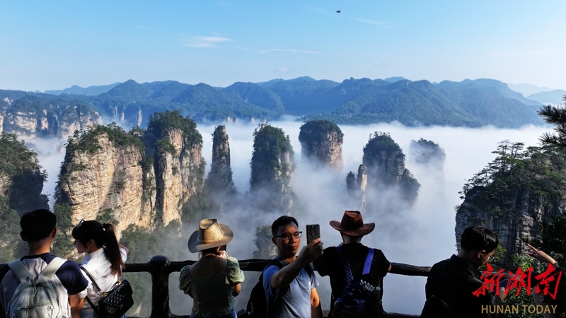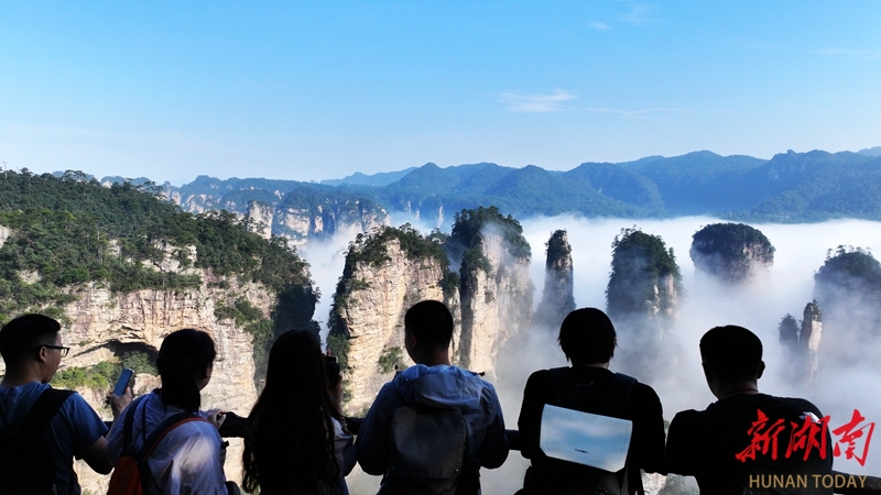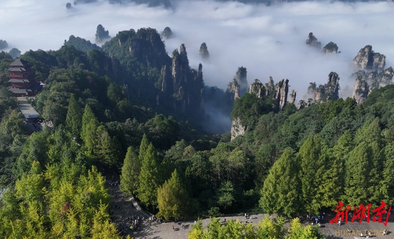 10月5日,张家界国家森林公园天子山景区迎来绝美秋日云海景观。云雾缭绕间,峰林若隐若现,宛如仙境般的自然奇观让游客赞叹不已。吴勇兵 摄 (湖南图片库)