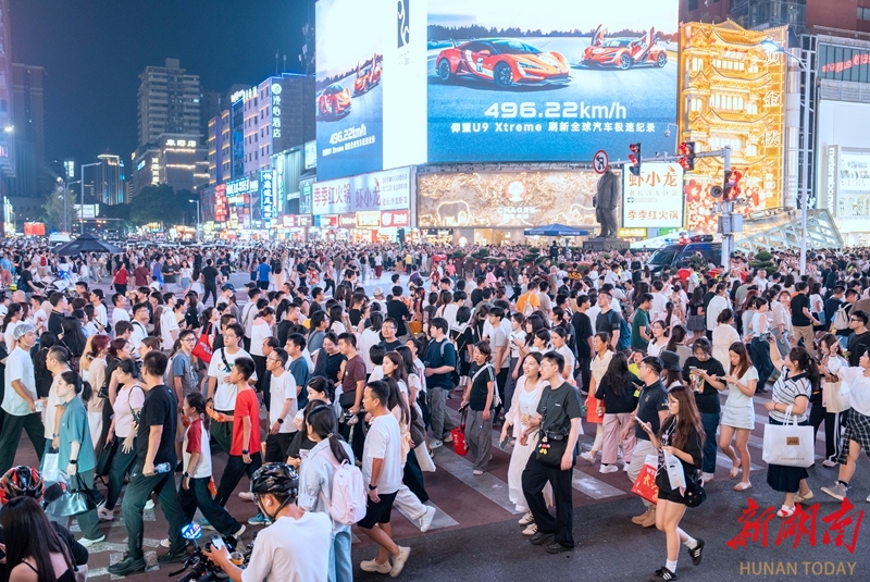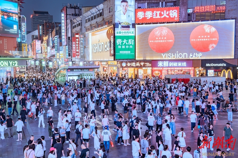 10月5日,长沙市解放西路人潮涌动,处处洋溢着浓厚的节日氛围。国庆中秋假期,省会长沙继续迎来客流量高峰,旅游市场活力旺。 湖南日报全媒体记者 李健 摄
