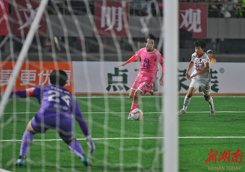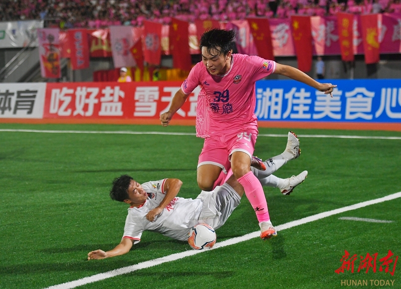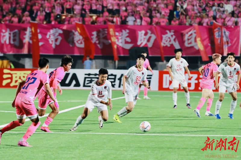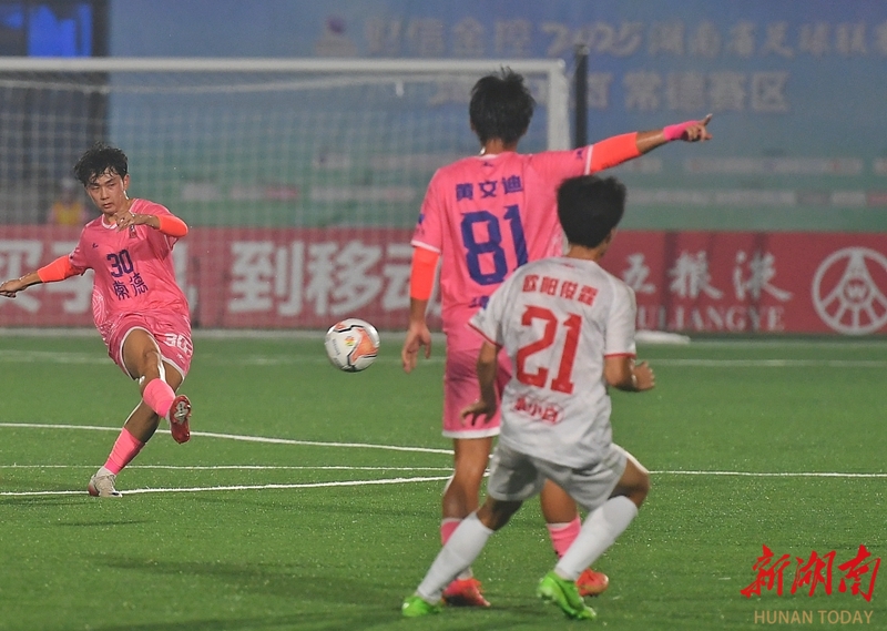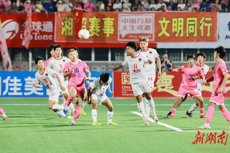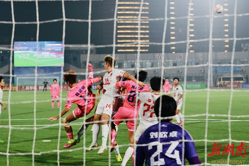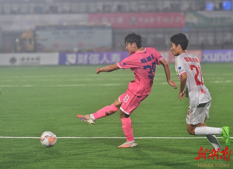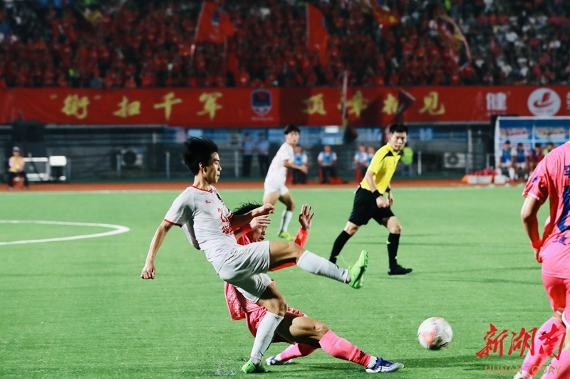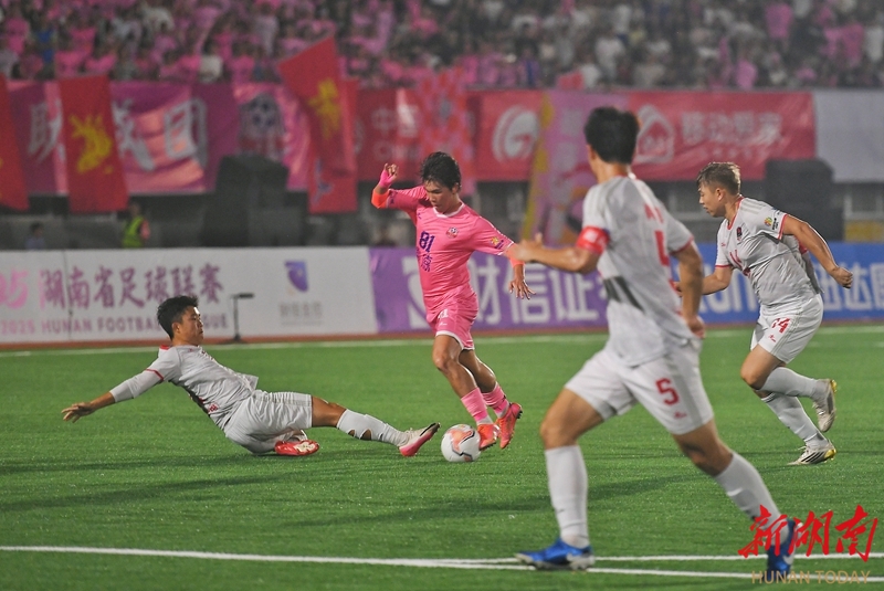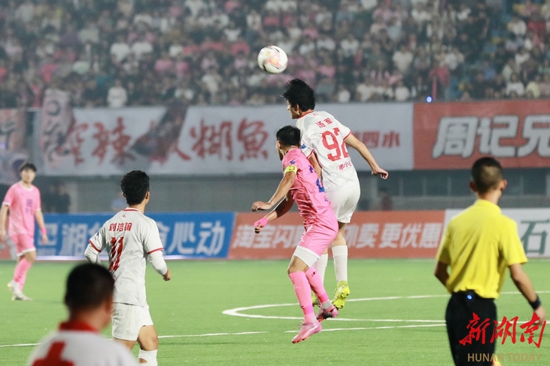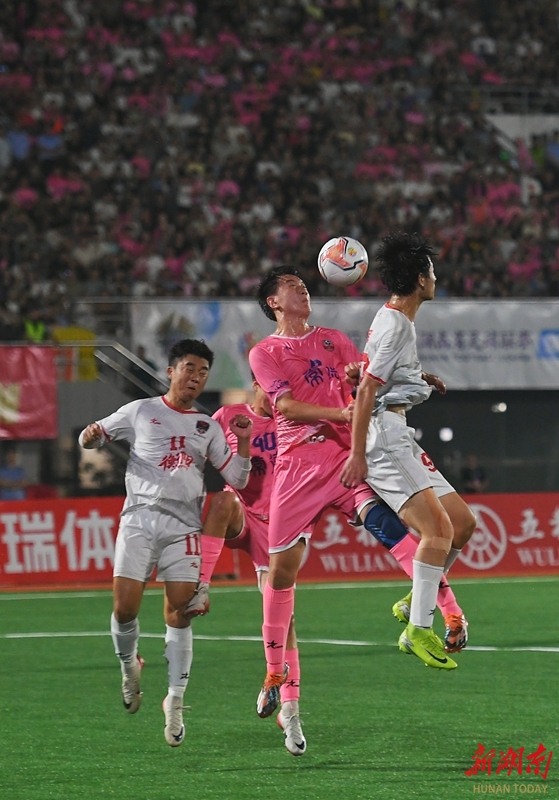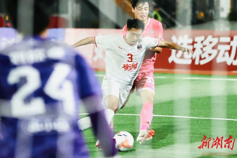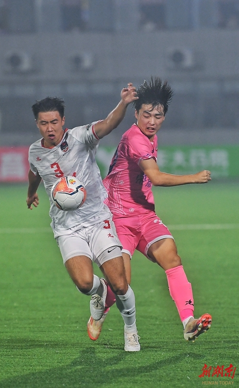 10月5日晚,常德市体育运动中心,两队球员在比赛中奋力拼抢。当天,2025湖南省足球联赛(简称“湘超联赛”)常德队主场对阵衡阳队,最终双方0比0战平。湖南日报全媒体记者 傅聪 摄