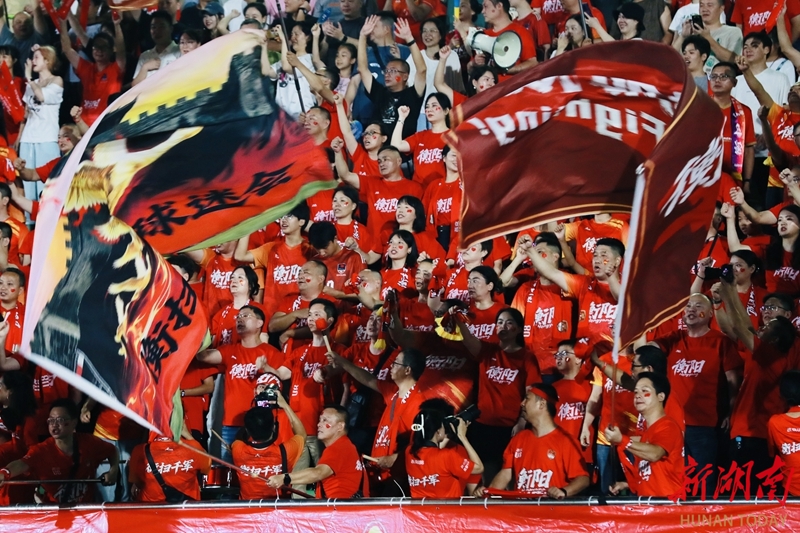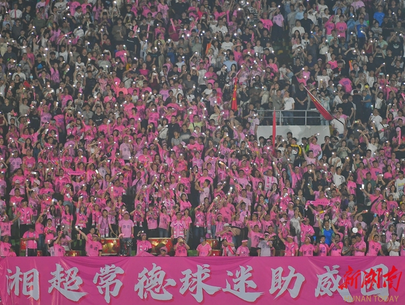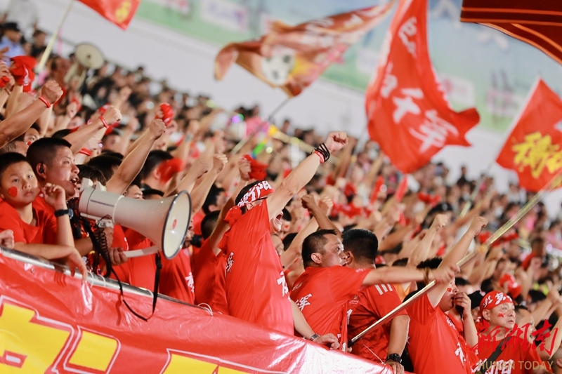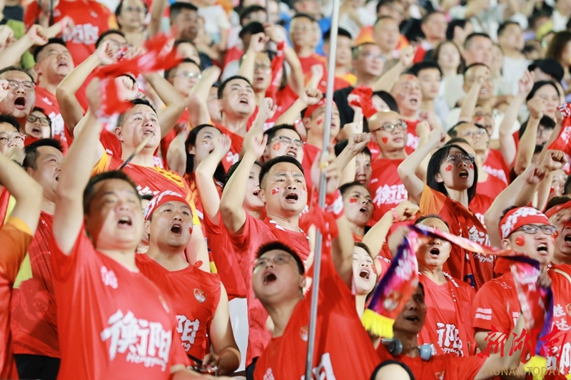 10月5日晚,常德市体育运动中心,球迷在呐喊助威。当天,2025湖南省足球联赛(简称“湘超联赛”)常德队主场对阵衡阳队,最终双方0比0战平。罗茂盟 摄(湖南图片库)