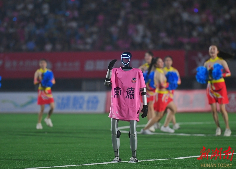 10月5日晚,常德市体育运动中心,机器人闪亮登场,为观众带来一场憨态可掬的趣味互动秀。当天,2025湖南省足球联赛(简称“湘超联赛”)常德队主场对阵衡阳队,最终双方0比0战平。湖南日报全媒体记者 傅聪 摄