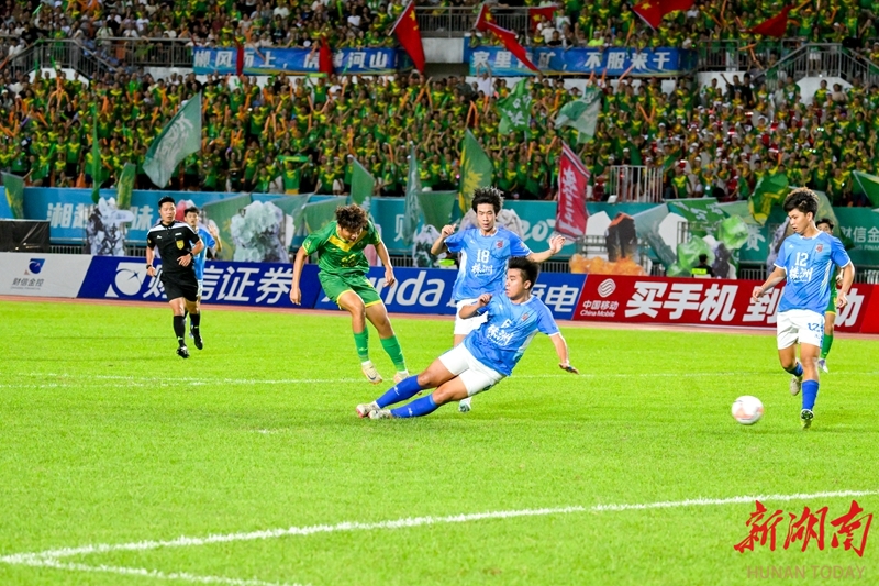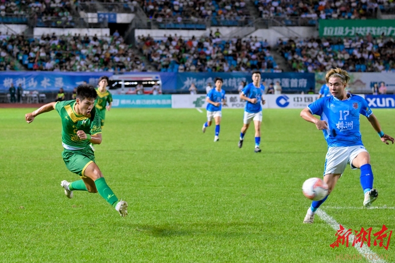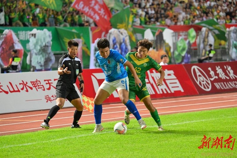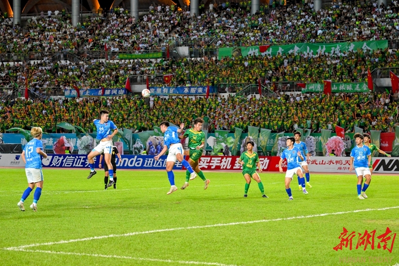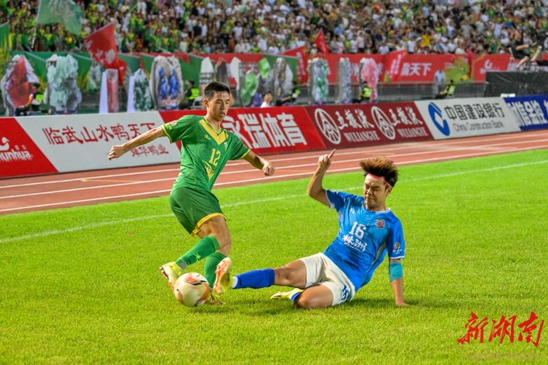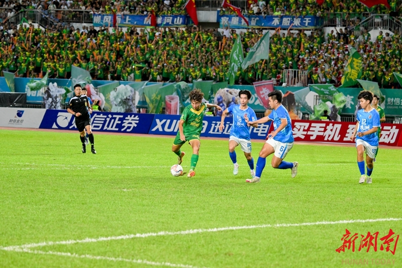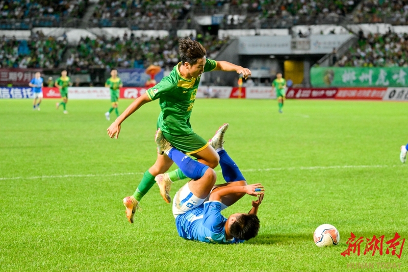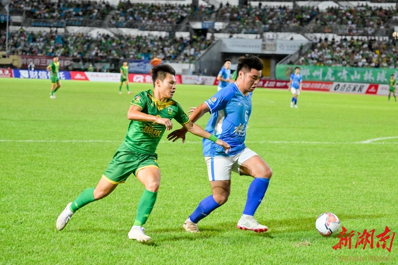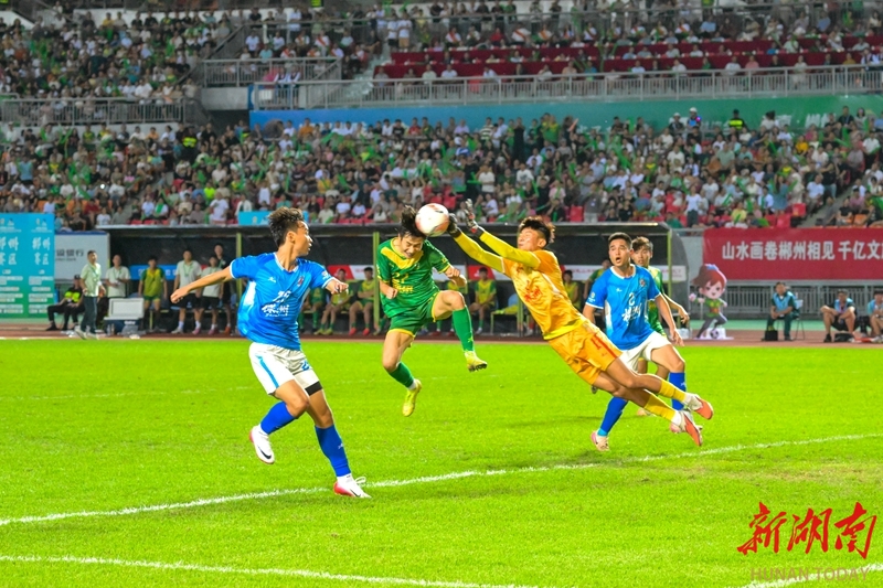 10月5日晚,郴州市体育中心,两队球员在比赛中奋力拼抢。当天,2025湖南省足球联赛(简称“湘超联赛”)郴州队主场对阵株洲队,最终双方1比1战平。陈哲君 摄(湖南图片库)