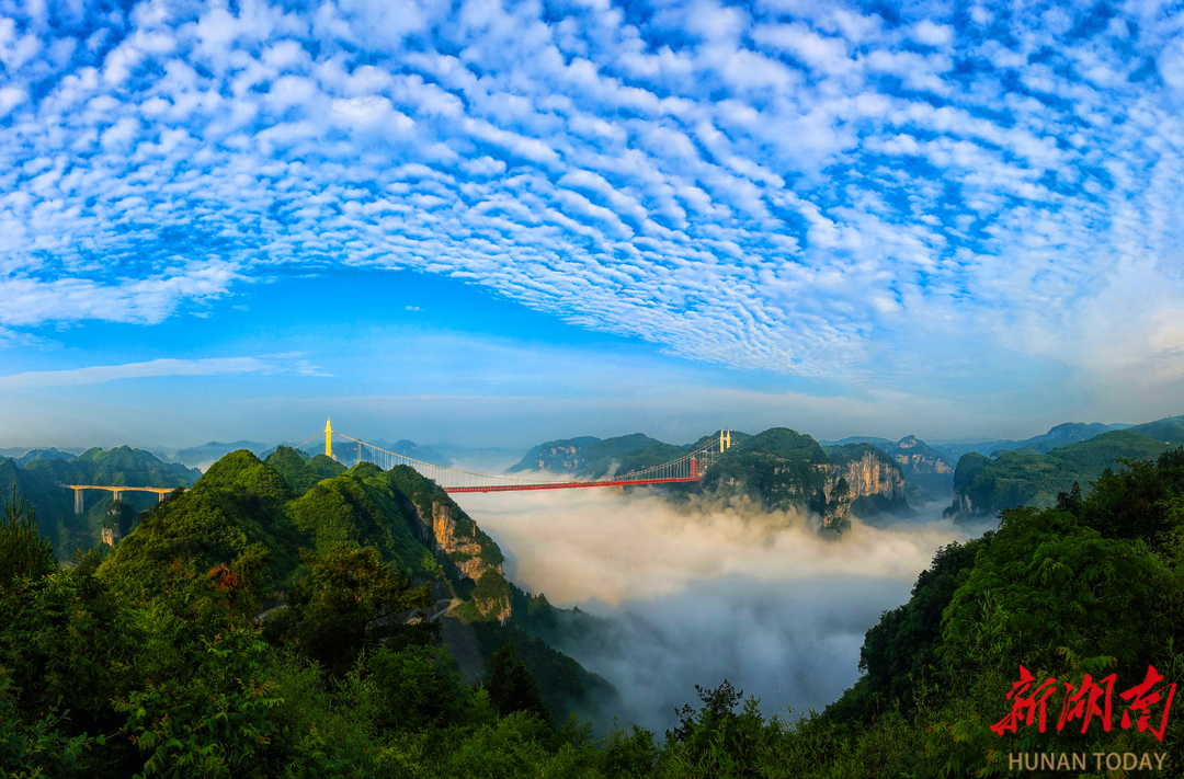 2012年3月31日,矮寨大桥历经近五年艰苦建设正式通车。这座超级工程一举创下四个世界第一,凝聚着各族建设者智慧与汗水。矮寨大桥彻底改写了湘西交通闭塞的历史,在中国基建史上留下了浓墨重彩的一笔,被誉为“中国的圆月亮”。它见证了湘西高速公路从无到有,更铭刻下精准扶贫带来的巨大变迁,树立起新时代的精神标高。