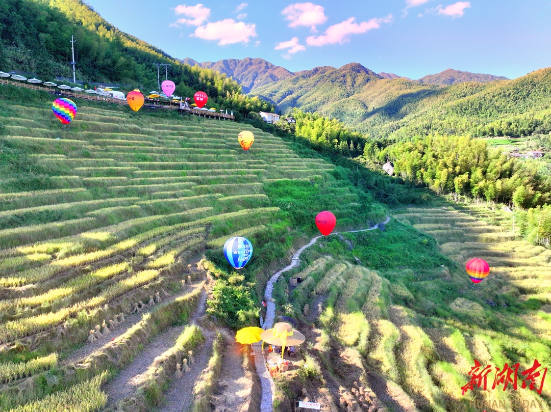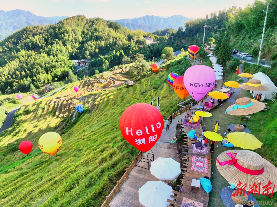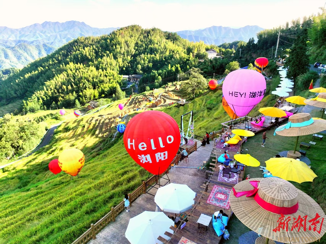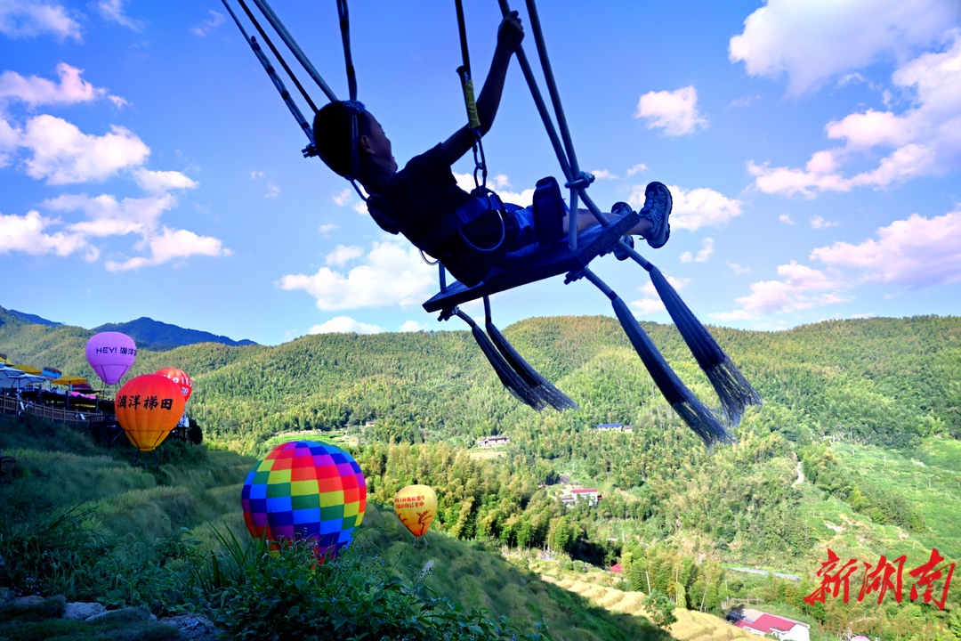 10月6日,游客在浏阳市张坊镇上洪村的湖洋梯田景区休闲游玩。国庆中秋假期,该景区推出多项特色活动,新增热气球、秋千、网床及高空玻璃观景台等打卡点,融合传统与现代业态,吸引了大量游客前来体验农耕文化和自然风光,带动当地民宿经济蓬勃发展。湖南日报全媒体记者 郭立亮 通讯员 李智玲 摄影报道