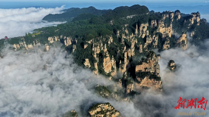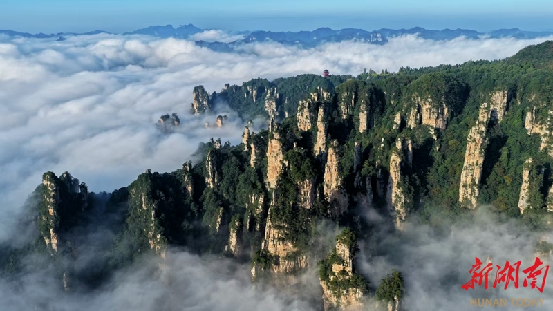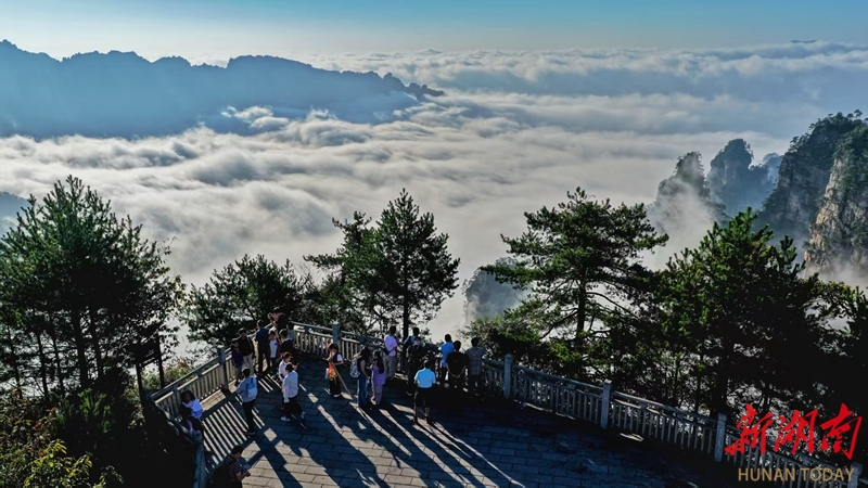 10月6日清晨,张家界国家森林公园天子山景区出现云海景观,流云在群峰间流转涌动,宛如泼墨山水画卷,令游客惊叹不已。彭斌 摄(湖南图片库)