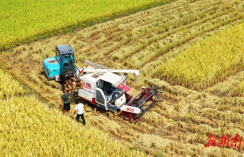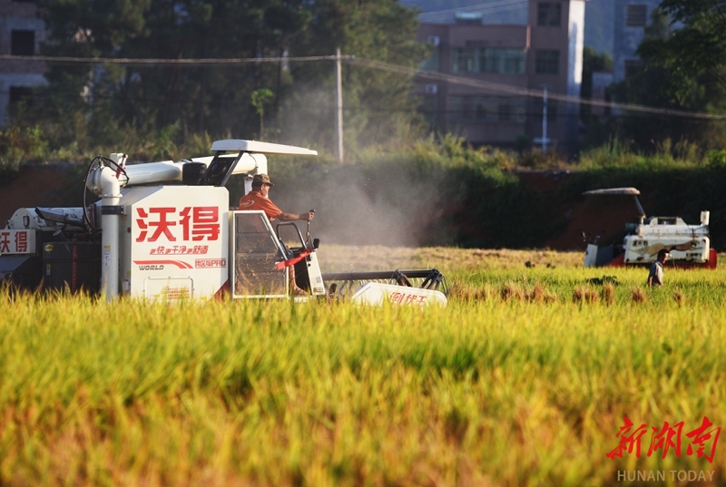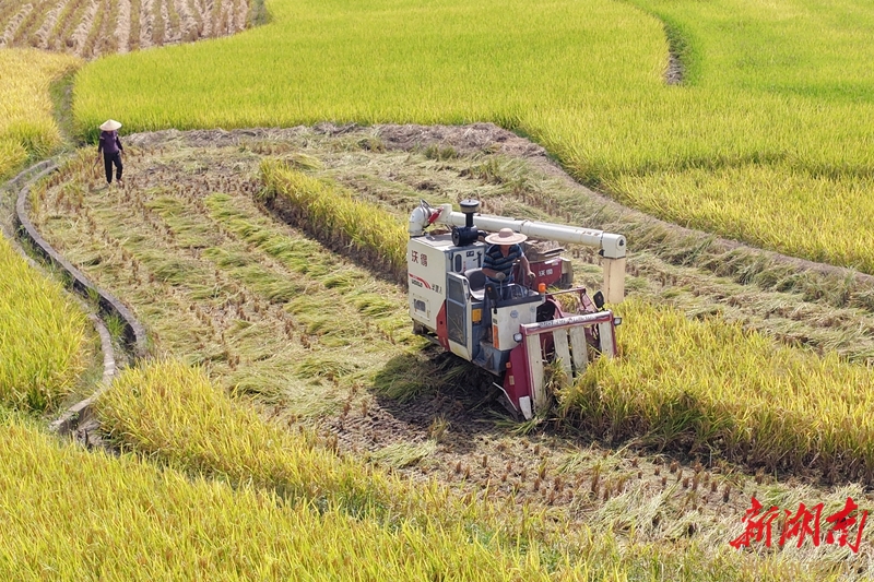 10月8日,嘉禾县坦坪镇石富冲村,来自河南省驻马店市的农机员驾驶农机为村民收割晚稻。时下正是晚稻成熟收获季,河南、安徽、贵州等地的农机员开展跨省作业 ,助力当地晚稻收割。黄春涛 摄(湖南图片库)