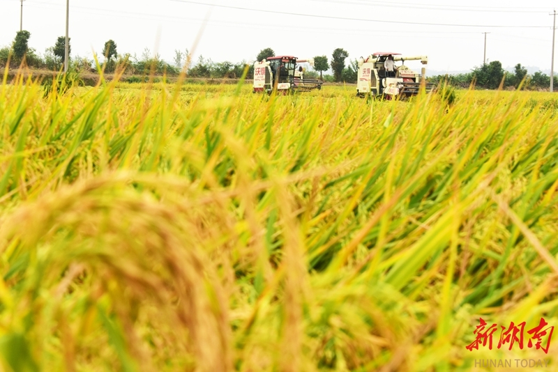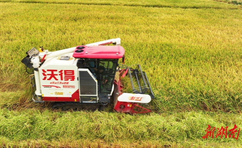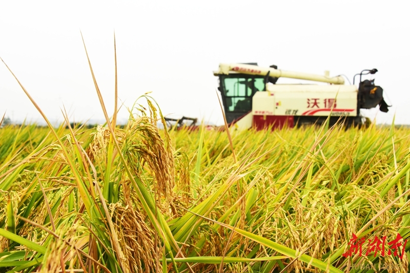 10月8日,澧县澧南镇刘市社区,农民驾驶收割机收割晚稻。时下,该县种植的早熟晚稻品种陆续进入成熟期,当地全面启动晚稻机收工作,确保丰产丰收。柏依朴 摄(湖南图片库)