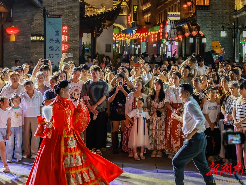 镖传四海、护税征厘、把总缉私等蕴含商道文化特色的情景剧,勾勒出洪江古商城市井图景,不少游客通过扮演镖师、税官等角色深度参与互动,体验洪江当年“商贾云集”的繁华盛况。夜幕降临,“又见小城故事”沉浸式演艺接续登场,歌舞与情景剧节目以快闪形式在洪江古商城“烟雨洪江”街区上演,游客跟随演员穿行街巷,欣赏戏曲、歌舞、员外招婿等沉浸式表演,充分感受洪江古商城旅游区的夜间魅力。