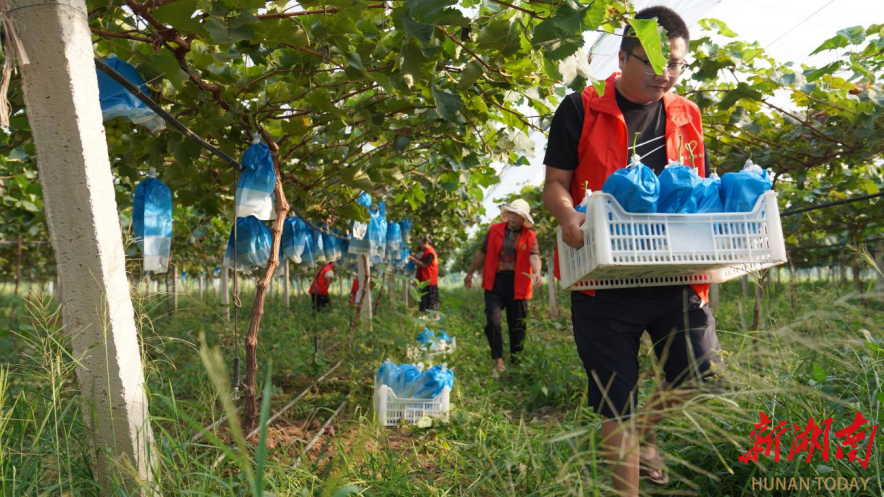 图为古大堤村党员志愿者为种植大户采收葡萄