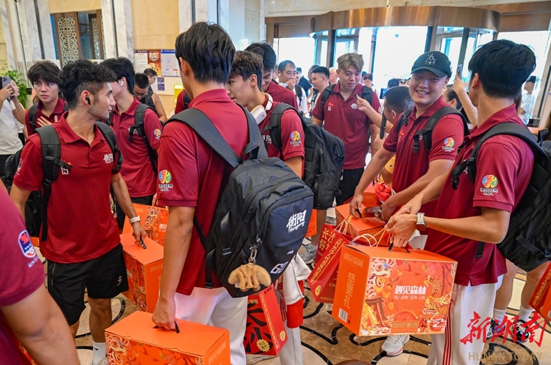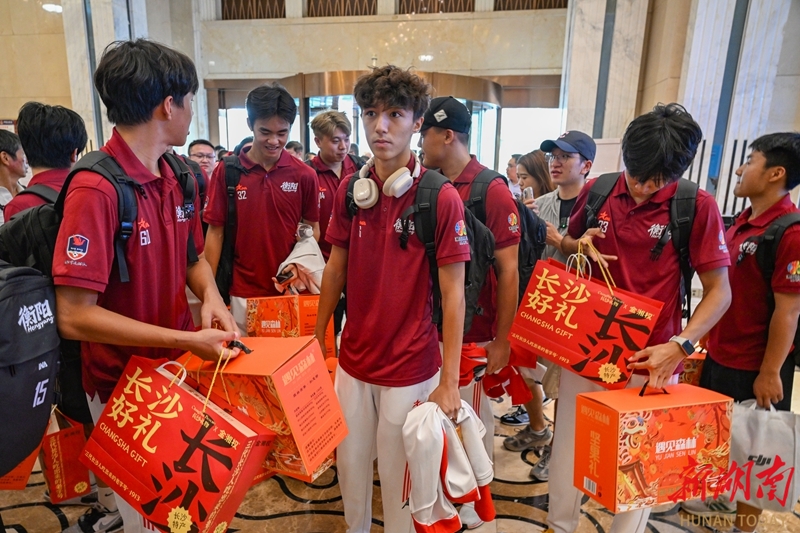 10月9日,衡阳队抵达长沙下榻酒店,长沙市体育局、天心区文旅体局相关领导为衡阳队的球员、教练员送上丰富的大礼包,包含水果茶、臭豆腐、酱板鸭和长沙特色文创周边等,进一步营造热烈、友好、专业的比赛氛围,传递城市友好温度。10日晚,湘超联赛第五轮将迎来一场焦点战,长沙队将坐镇长沙贺龙体育中心主场迎接衡阳队的挑战。湖南日报全媒体记者 郭立亮 摄