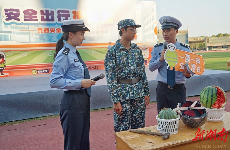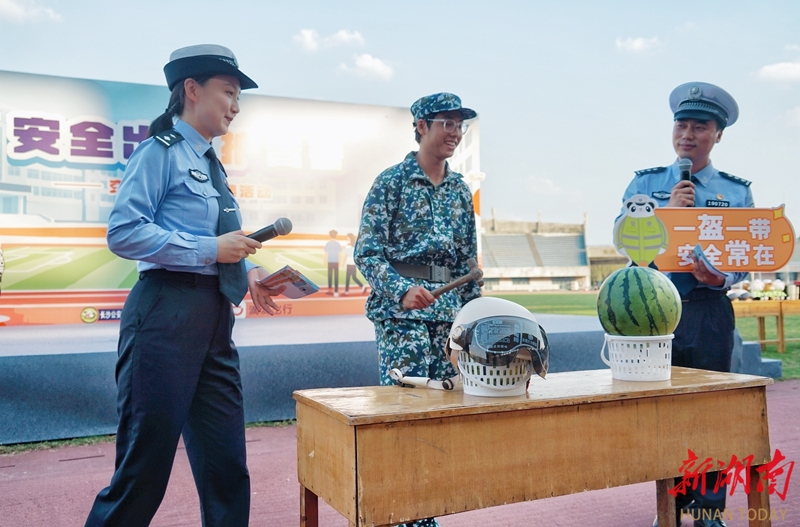 10月9日,中南大学体育场,长沙交警通过“西瓜实验”向新生宣传佩戴安全头盔的重要性。当天,长沙交警与中南大学联合开展“开启安全新学期 守护青春每一步”交通安全宣传活动。通过“交通标语你比我猜”“盲区体验”“戴头盔比赛”“骑单车比赛”等多个趣味互动环节,提升学生交通安全意识与自我防护能力。湖南日报全媒体记者 徐行 通讯员 石双权 摄影报道