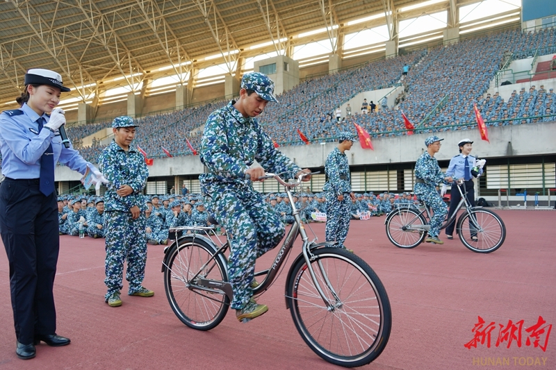 10月9日,中南大学体育场,长沙交警指导新生如何安全骑行。当天,长沙交警与中南大学联合开展“开启安全新学期 守护青春每一步”交通安全宣传活动。通过“交通标语你比我猜”“盲区体验”“戴头盔比赛”“骑单车比赛”等多个趣味互动环节,提升学生交通安全意识与自我防护能力。湖南日报全媒体记者 徐行 通讯员 石双权 摄影报道