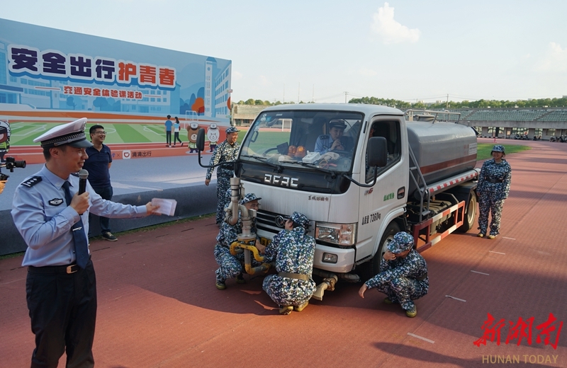 10月9日,中南大学体育场,长沙交警通过货车盲区演示,提醒学生注意道路安全。当天,长沙交警与中南大学联合开展“开启安全新学期 守护青春每一步”交通安全宣传活动。通过“交通标语你比我猜”“盲区体验”“戴头盔比赛”“骑单车比赛”等多个趣味互动环节,提升学生交通安全意识与自我防护能力。湖南日报全媒体记者 徐行 通讯员 石双权 摄影报道