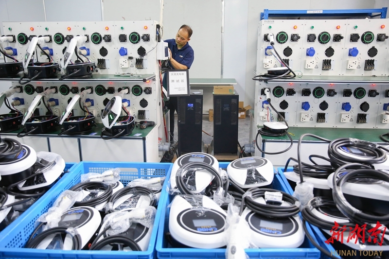 10月9日,隆回高新技术产业开发区湖南京能新能源科技有限公司测试车间,工人正在测试交流充电桩。“双节”假期结束,隆回县各企业开足马力,全力冲刺四季度。曾勇 宁其风 摄影报道(湖南图片库)