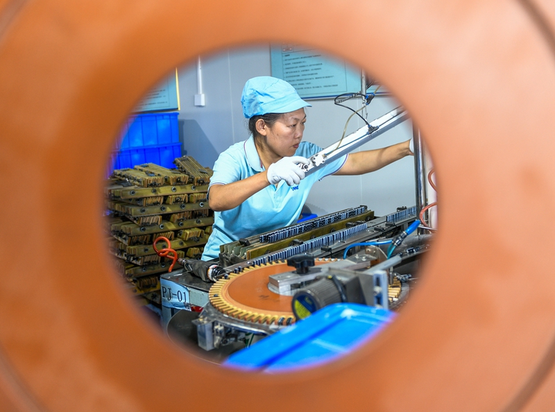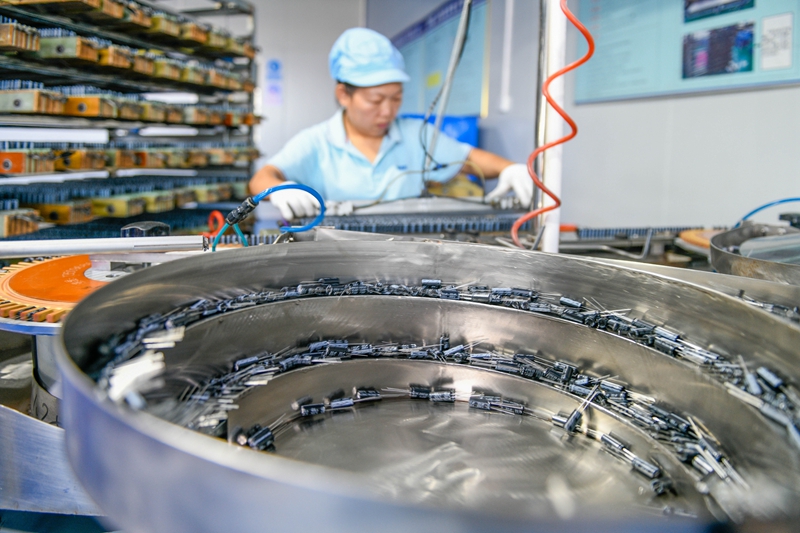 10月9日,道县高新技术产业开发区湖南建顺电子有限公司,工人在铝电解电容器生产流水线上作业。当天是国庆中秋假期过后的第一个工作日,当地企业开足马力,加紧生产,赶制订单。蒋克青 摄(湖南图片库)