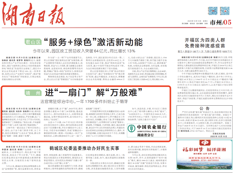 如今,该县的县、乡镇、村(社区)三级综治中心成了靖州群众解纷止争的“超市”。“全县综治中心一年接待来访3000余人次,1700多件纠纷止于萌芽。”县综治中心主任陈佳称赞,“法院力量功不可没!”