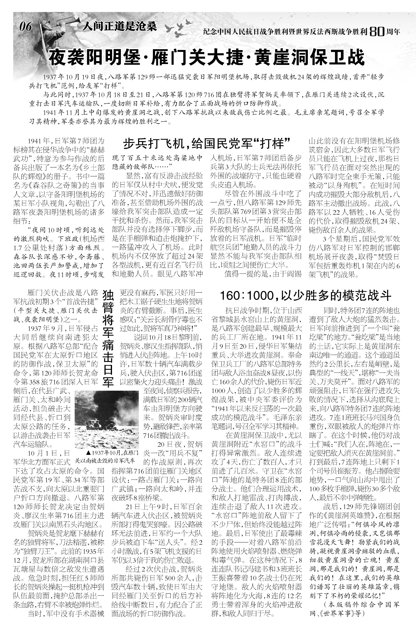 1937年10月19日夜,八路军第129师一部迅猛突袭日军阳明堡机场,取得击毁敌机24架的辉煌战绩,首开“轻步兵打飞机”范例,给友军“打样”。