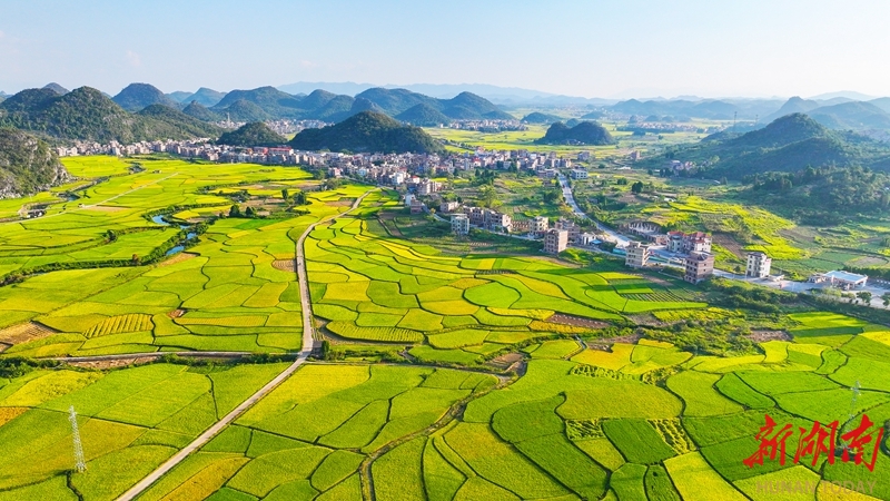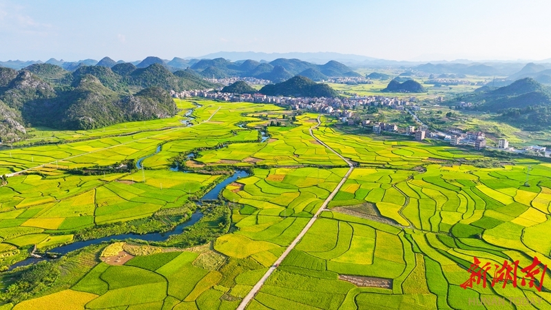 10月10日,新田县石羊镇南国武当山下万亩富硒水稻基地,广袤田野里水稻次第成熟,与河流、村庄、公路等交相辉映,绘就一幅美丽的田园丰收画卷。刘贵雄 摄(湖南图片库)