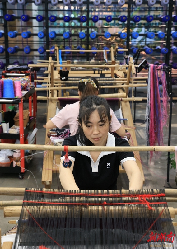 10月10日,张家界市土家族织锦生产研发基地,工人在加工土家族织锦产品。为应对秋冬季市场需求,张家界市土家织锦企业积极创新产品设计,推出双面锦披肩、围巾等个性化土家族织锦产品。时下,企业开足马力赶制订单,确保新品及时供应市场。吴勇兵 摄(湖南图片库)
