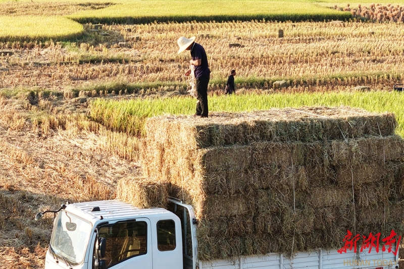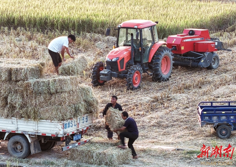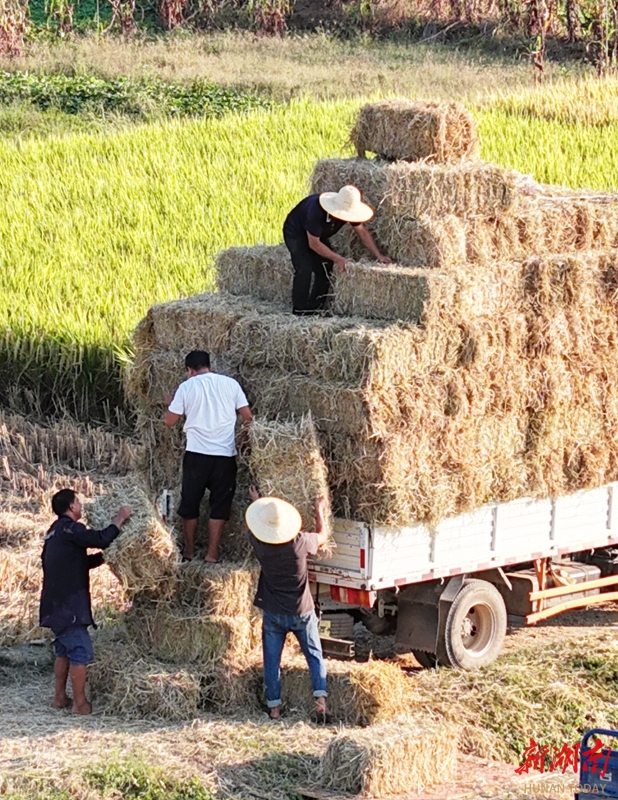 10月10日,新田县石羊镇长亭村,村民在装运打捆稻草。近年来,该县大力推广秸秆综合利用,将农作物秸秆深加工,用于养殖、生物质发电或粉碎还田,实现变废为宝,有效提高了秸秆综合利用率,促进农业绿色循环发展。黄春涛 摄(湖南图片库)