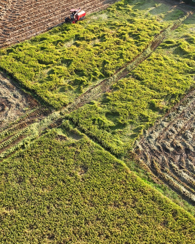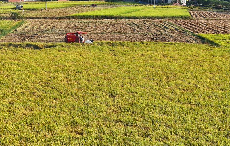 10月10日,衡东县大浦镇,村民驾驶农机收割稻谷。金秋时节,该县的水稻进入收割季,村民抢抓晴好天气收割稻谷,田间地头一派忙碌的丰收景象。曹正平 王峥 摄影报道(湖南图片库)