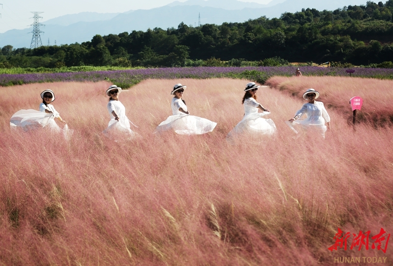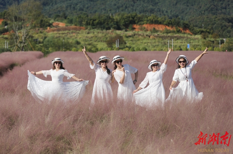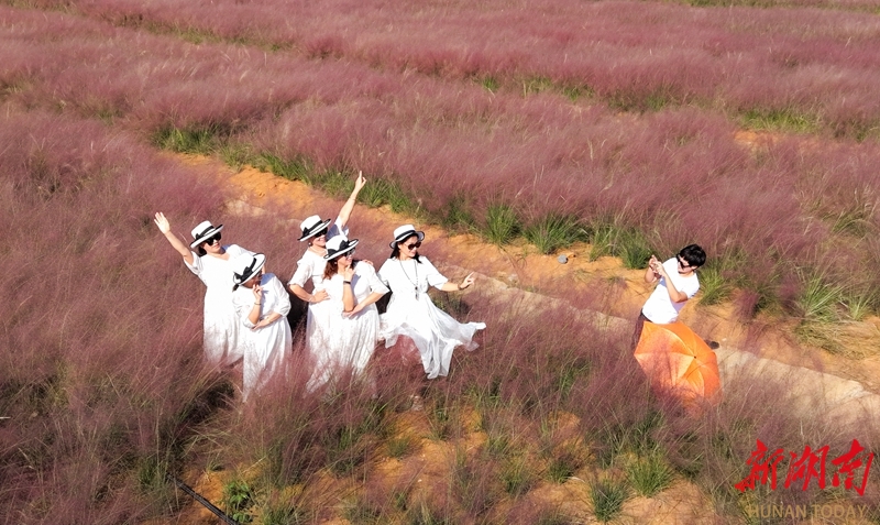 10月8日,游客在郴州市城东新区城市花海拍照打卡。时下,此处成片的粉黛乱子草正烂漫绽放,如云似霞,吸引不少游客慕名前来赏花观景。 黄建华 摄(湖南图片库)