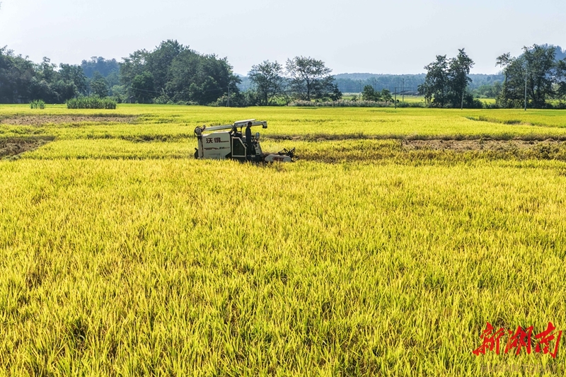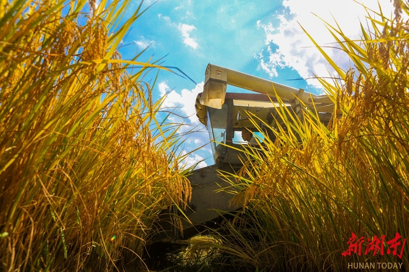 10月10日,道县寿雁镇周塘村,农民驾驶农机收割水稻。金秋时节,当地水稻喜迎丰收,农民抢抓晴好天气,加紧收割加工。蒋克青 摄(湖南图片库)