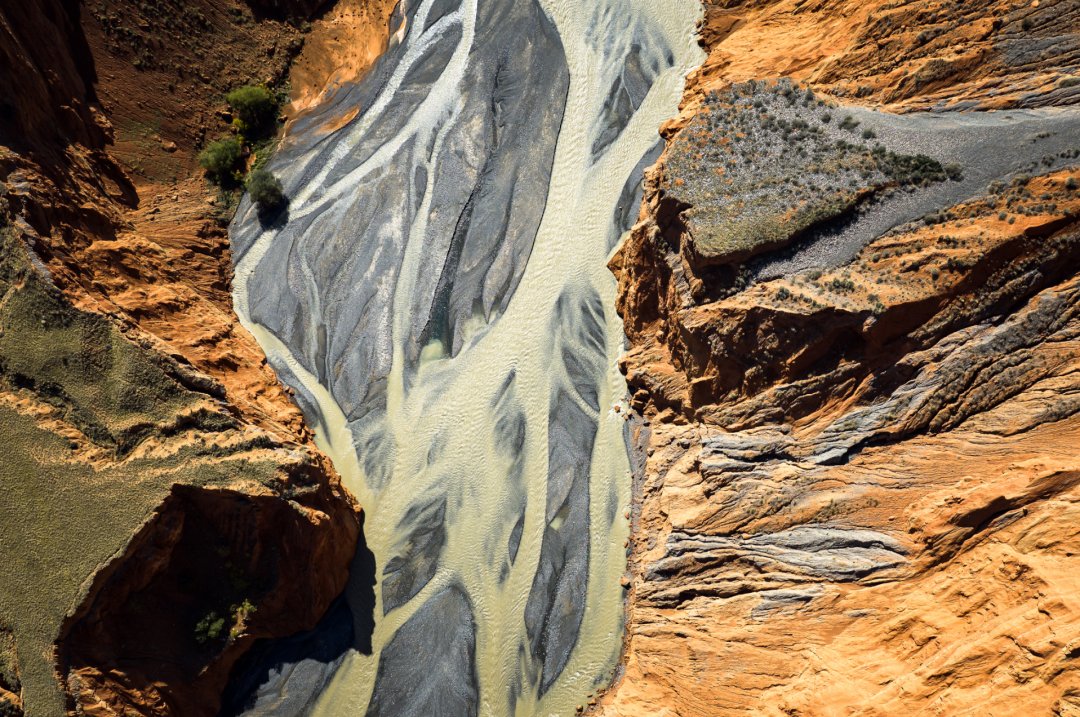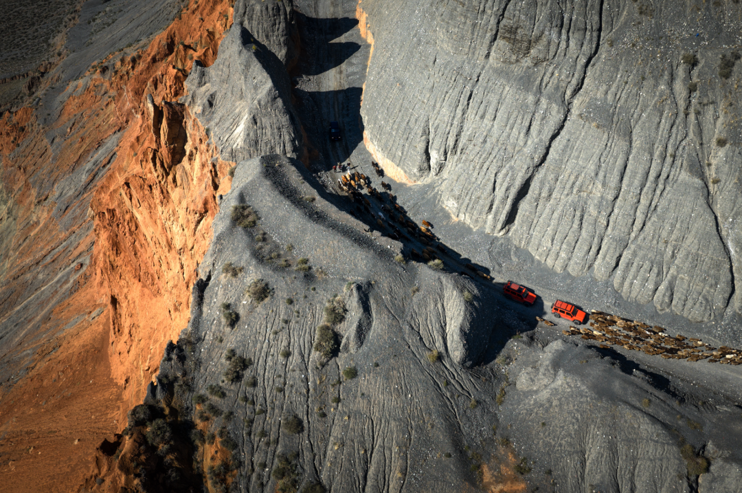 安集海大峡谷是我梦里的主宰:巴音沟河(清澈如翡翠)与巴间沟河(浑浊似琥珀)剧烈碰撞,清浊泾渭分明又交融成奔腾血脉。崖壁上绛红、黛青、雪白交织如流动油画,阳光斜照时,三价铁沉积层泛着金属光泽,似凝固火焰与天山白雪形成鲜明对比。俯瞰谷底,安集海河蜿蜒如带,牛羊马匹在山道上仅为小点,渺小生命与磅礴峡谷诠释着“一沙一世界”的隐喻。
