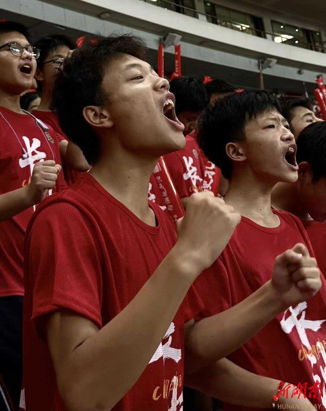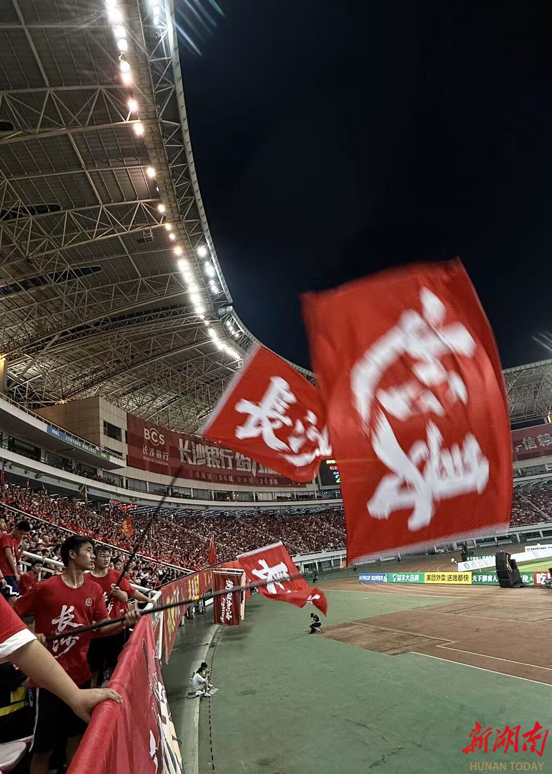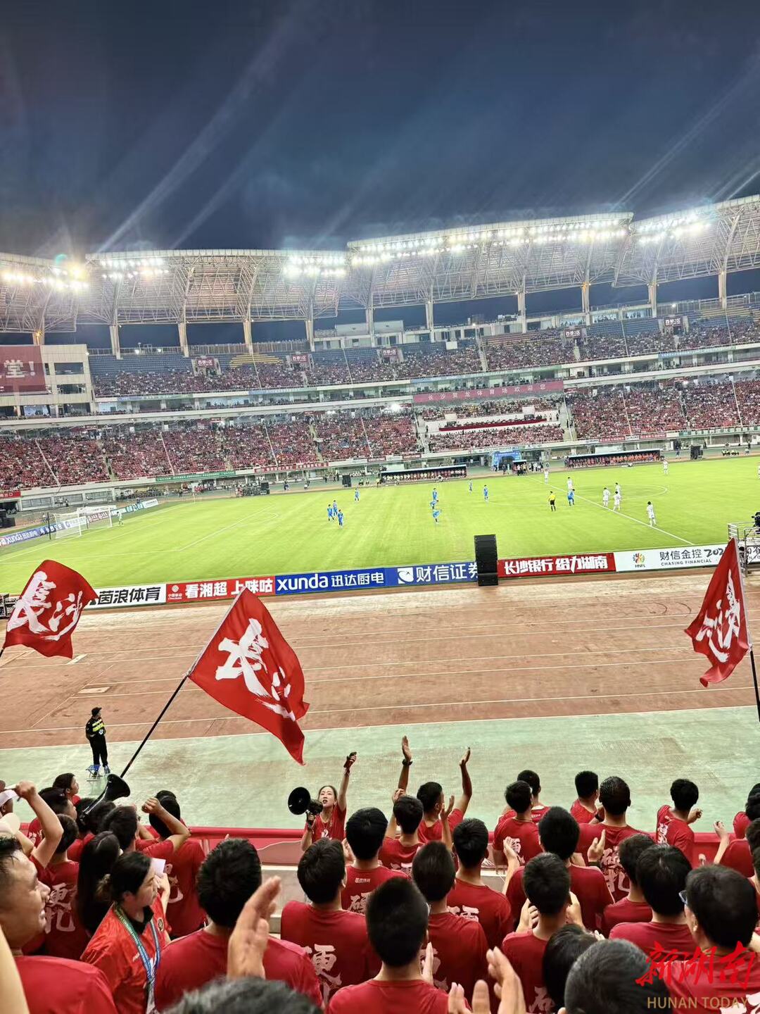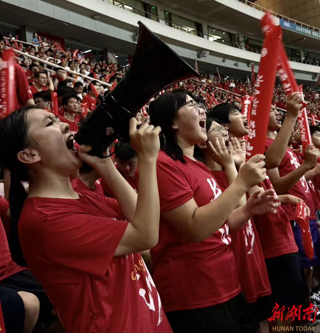 10月10日晚,长沙贺龙体育中心人声鼎沸。湘超联赛长沙对阵衡阳的焦点战在此打响。由长沙市贺龙体育运动学校400余名师生组成的“势不可挡”啦啦队,用整齐划一的加油声浪点燃全场。戴慧敏 摄 (湖南图片库)
