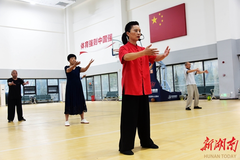 10月10日,常德市委党校体育馆,学员在老师的指导下练习太极拳。连日来,常德市老年保健知识义务宣传员第十二期培训班举行,邀请专家从中医养生、运动养生、膳食养生等方面,为当地老年保健协会的学员传授相关知识,助力健康养老。柏依朴 摄(湖南图片库)