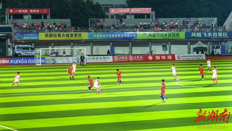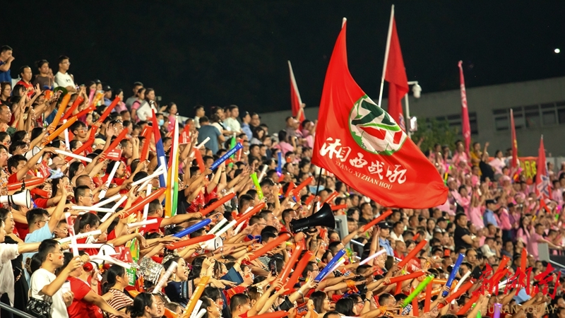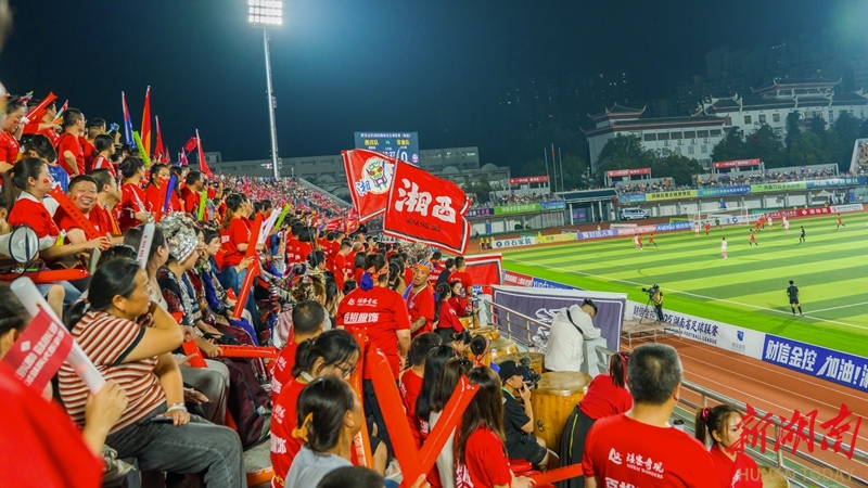 10月11日晚,球迷在呐喊助威。当天,湘超联赛进行第五轮比赛,湘西州队在凤凰县民族体育运动中心迎战常德队。最终湘西州队2比5不敌常德队。张寒烟 摄(湖南图片库)