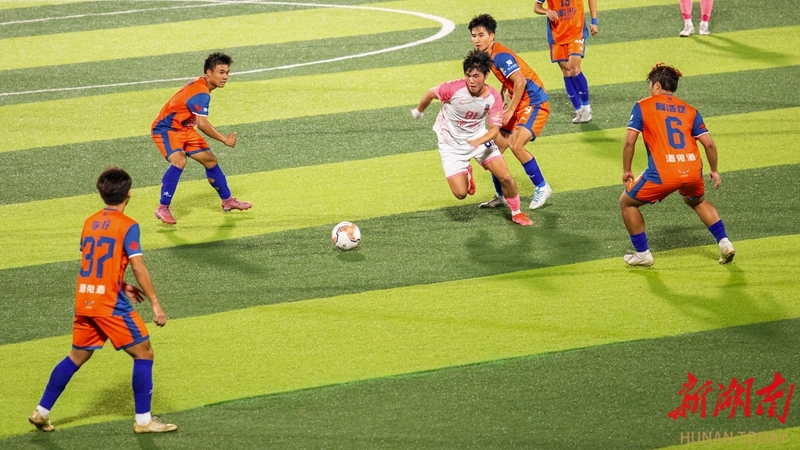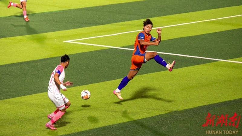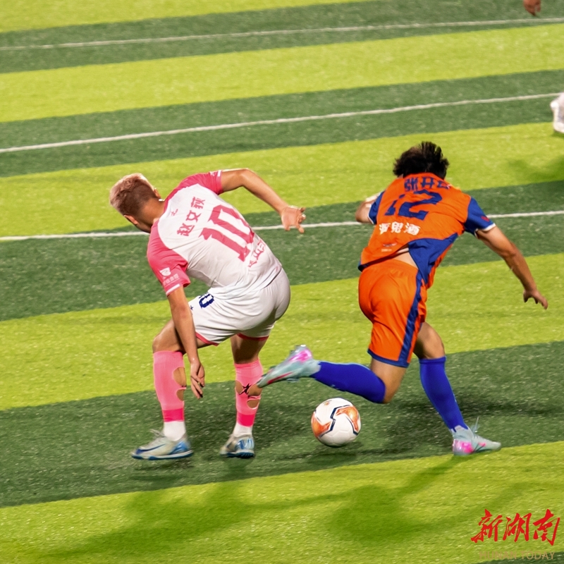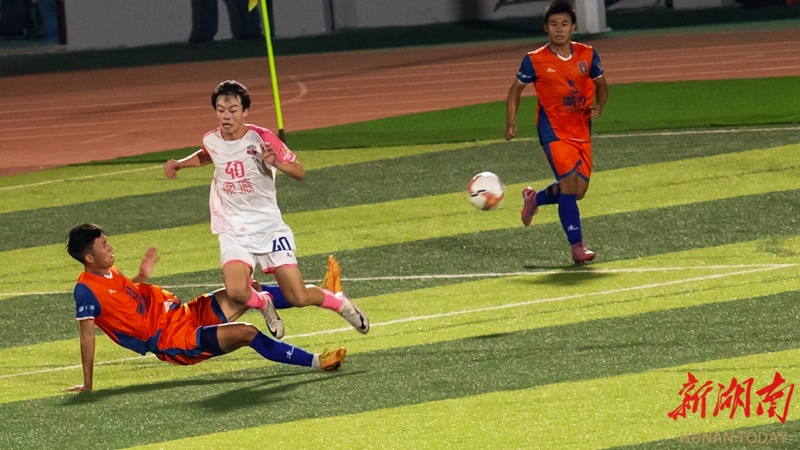 10月11日晚,湘西州队与常德队球员在比赛中激烈拼抢。当天,湘超联赛进行第五轮比赛,湘西州队在凤凰县民族体育运动中心迎战常德队。最终湘西州队2比5不敌常德队。张寒烟 摄(湖南图片库)