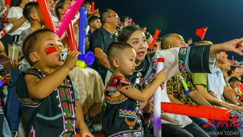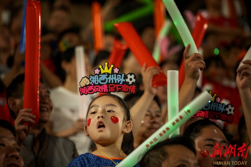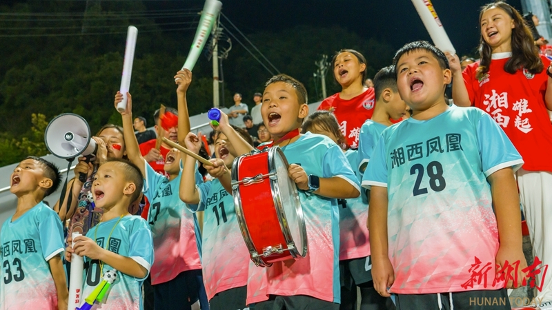 10月11日晚,小球迷在呐喊助威。当天,湘超联赛进行第五轮比赛,湘西州队在凤凰县民族体育运动中心迎战常德队。最终湘西州队2比5不敌常德队。张寒烟 摄(湖南图片库)