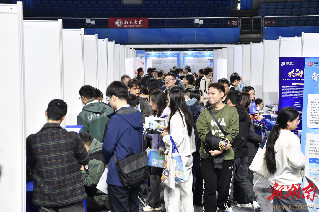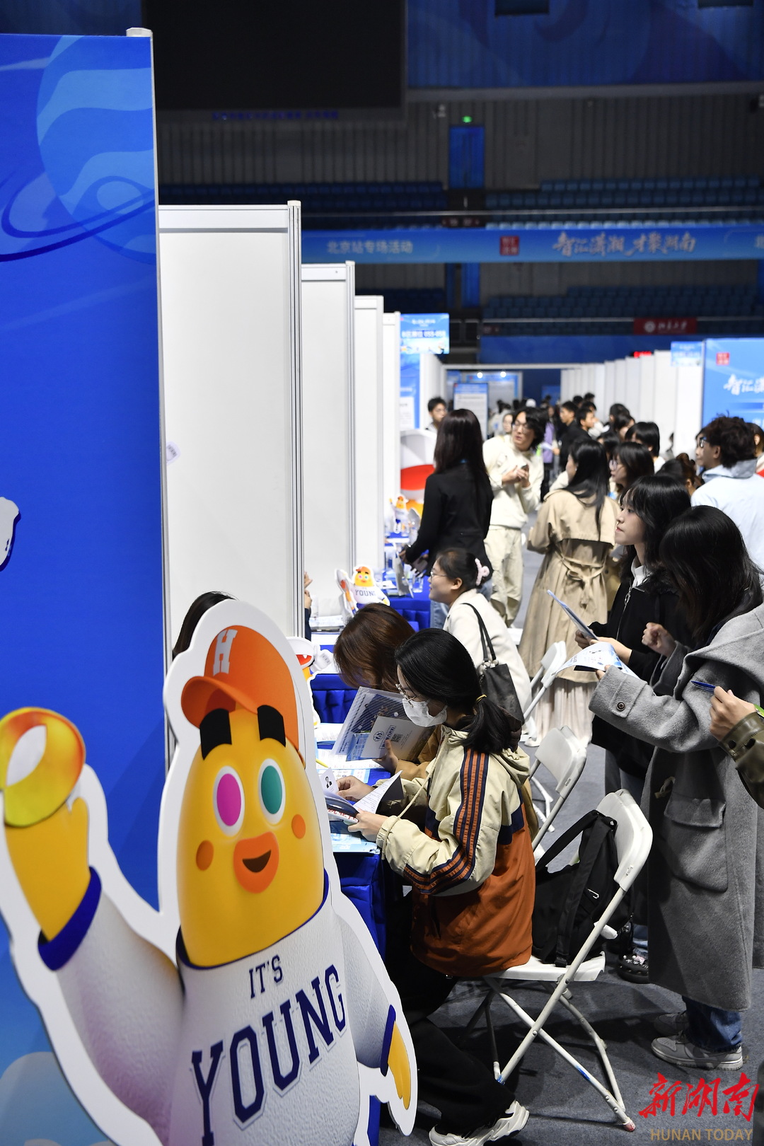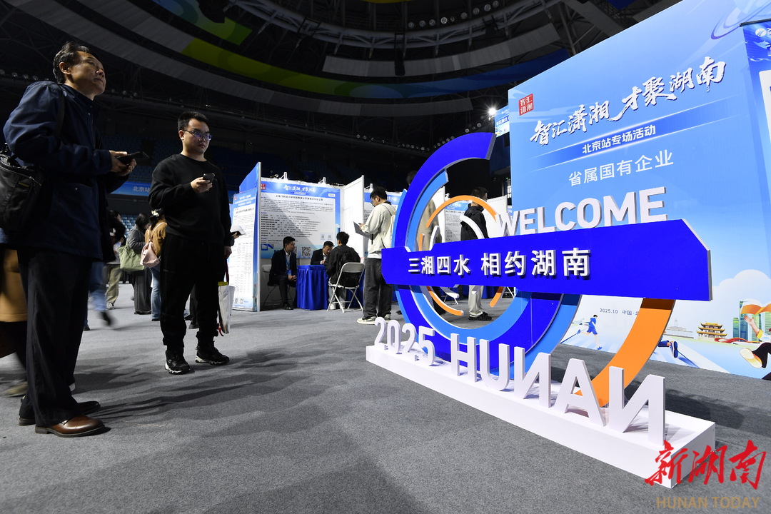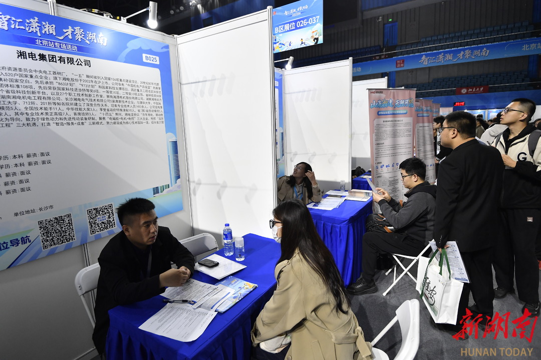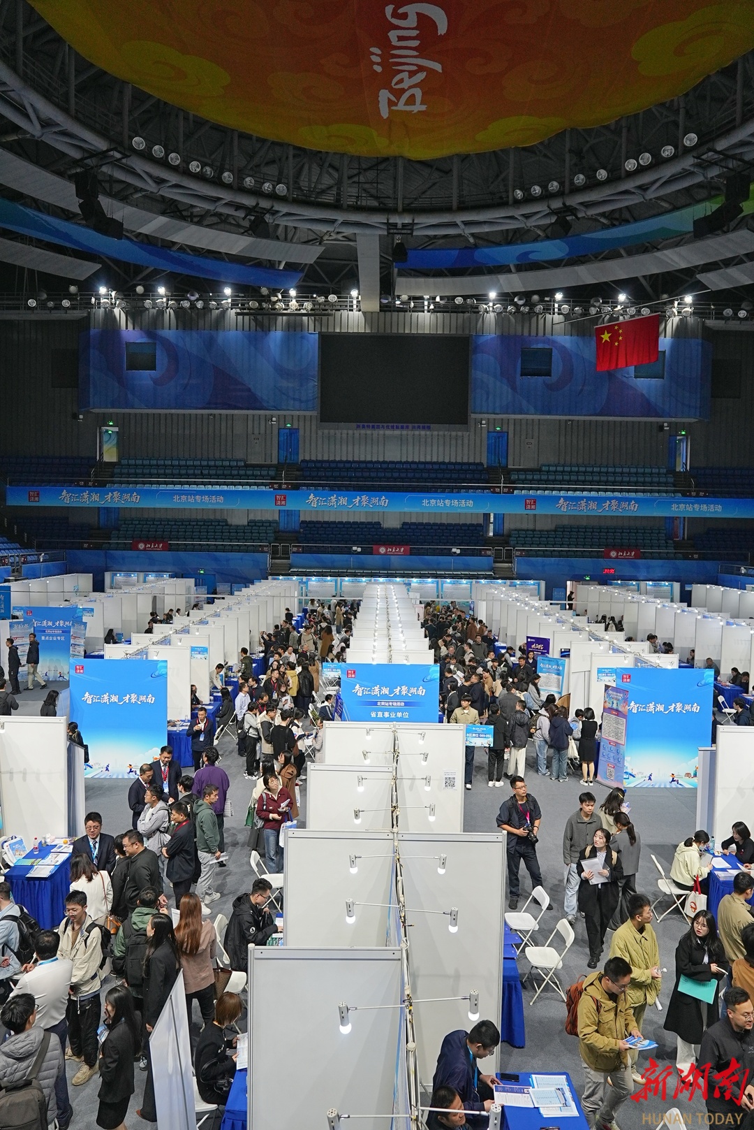 10月12日,“智汇潇湘 才聚湖南”北京站专场招聘活动推介大会在北京大学举行,现场发布了岗位需求目录。湖南近500家优质用人单位,超1.47万个岗位进京“招贤纳士”,彰显“求贤若渴、诚纳英才”的诚意。图为专场招聘活动现场。 湖南日报全媒体记者 童迪 傅聪 邹尚奇 摄影报道